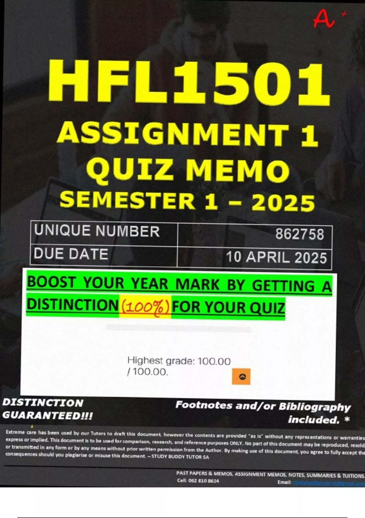 HFL1501 ASSIGNMENT 1 QUIZ MEMO - SEMESTER 1 - 2025 - UNISA – DUE DATE: - 10 APRIL 2025 (GUARANTEED A+!)
