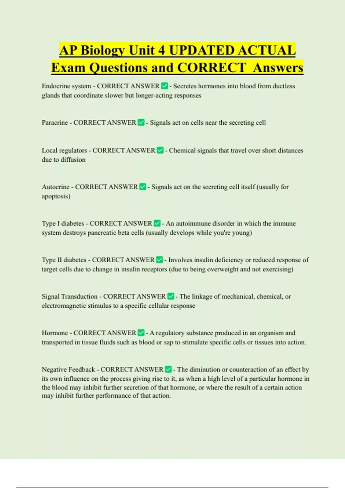 AP Biology Unit 4 UPDATED ACTUAL Exam Questions and CORRECT Answers Endocrine system - CORRECT ANSWER - Secretes hormones into blood from ductless glands that coordinate slower but longer-acting responses Paracrine - CORRECT ANSWER - Signals act on cells near the secreting cell Local regulators - CORRECT ANSWER - Chemical signals that travel over short distances due to diffusion