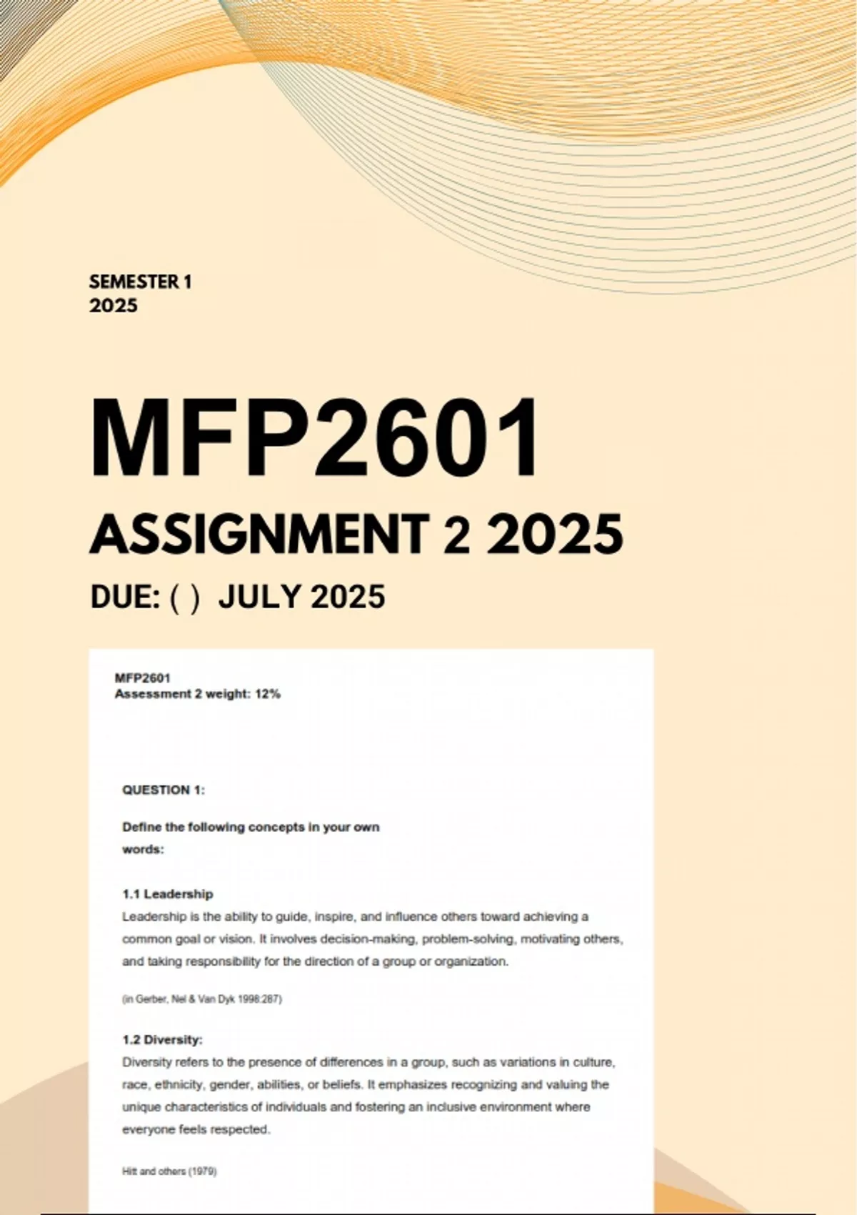 MFP2601 Assessment 2 weight: 12% QUESTION 1: Define the following concepts in your own words: 1.1 Leadership Leadership is the ability to guide, inspire, and influence others toward achieving a common goal or vision. It involves decision-making, problem-solving, motivating othand taking responsibility for the direction of a group or organization. (in Gerber, Nel & Van Dyk 1998:287)