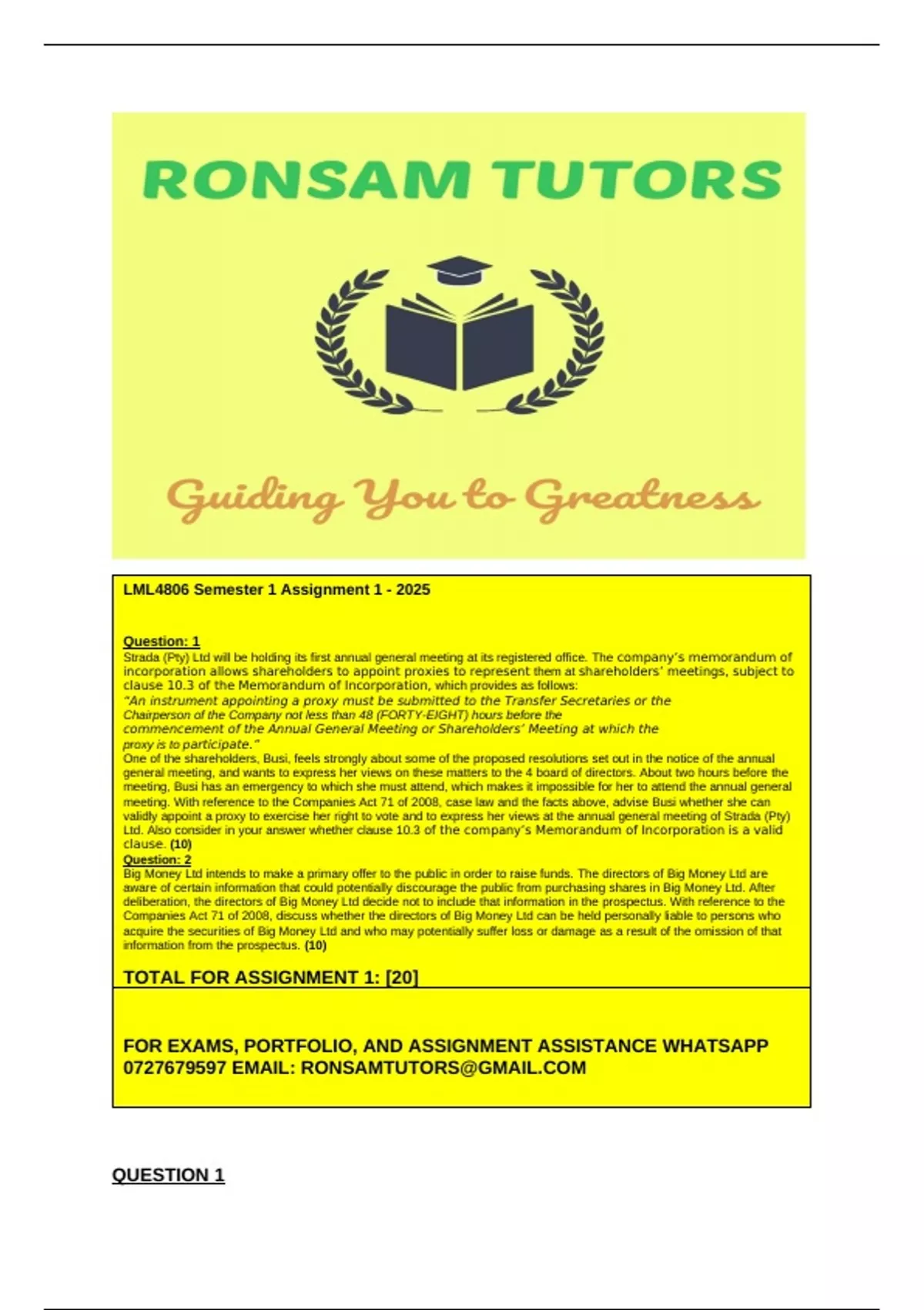 LML4806– Assignment 01 (Semester 1 2025) Answers Question: 1 Strada (Pty) Ltd will be holding its first annual general meeting at its registered office. The company’s memorandum of incorporation allows shareholders to appoint proxies to represent them at shareholders’ meetings, subject to clause 10.3 of the Memorandum of Incorporation, which provides as follows: “An instrument appointing a proxy must be submitted to the Transfer Secretaries or the Chairperson of the Company not less than 48 (FORTY-EIGHT) hours before the commencement of the Annual General Meeting or Shareholders’ Meeting at which the proxy is to participate.” One of the shareholders, Busi, feels strongly about some of the proposed resolutions set out in the notice of the annual general meeting, and wants to express her views on these matters to the 4 board of directors. About two hours before the meeting, Busi has an emergency to which she must attend, which makes it impossible for her to attend the annual general meeting. With reference to the Companies Act 71 of 2008, case law and the facts above, advise Busi whether she can validly appoint a proxy to exercise her right to vote and to express her views at the annual general meeting of Strada (Pty) Ltd. Also consider in your answer whether clause 10.3 of the company’s Memorandum of Incorporation is a valid clause. (10) Question: 2 Big Money Ltd intends to make a primary offer to the public in order to raise funds. The directors of Big Money Ltd are aware of certain information that could potentially discourage the public from purchasing shares in Big Money Ltd. After deliberation, the directors of Big Money Ltd decide not to include that information in the prospectus. With reference to the Companies Act 71 of 2008, discuss whether the directors of Big Money Ltd can be held personally liable to persons who acquire the securities of Big Money Ltd and who may potentially suffer loss or damage as a result of the omission of that information from the prospectus. (10)