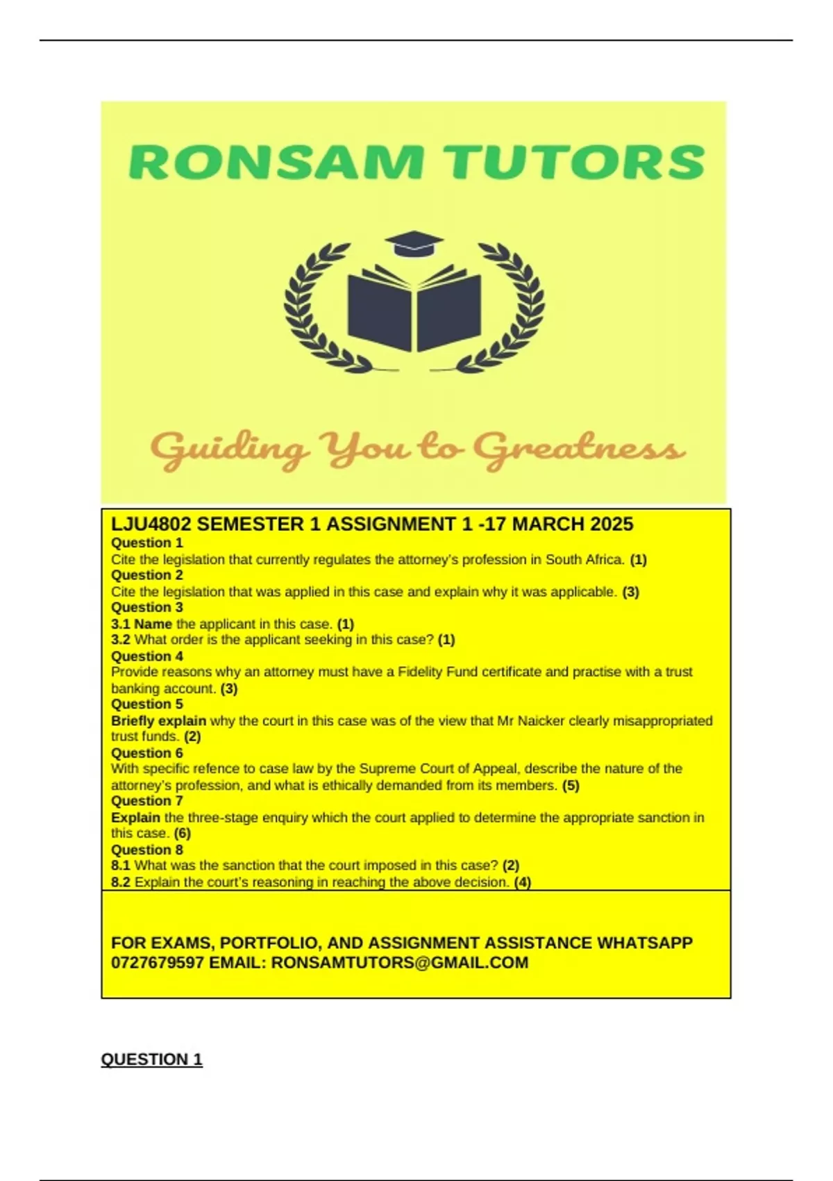 LJU4802– Assignment 01 (Semester 1 2025) Answers QUESTIONS: Question 1 Cite the legislation that currently regulates the attorney’s profession in South Africa. (1) Question 2 Cite the legislation that was applied in this case and explain why it was applicable. (3) Question 3 3.1 Name the applicant in this case. (1) 3.2 What order is the applicant seeking in this case? (1) Question 4 Provide reasons why an attorney must have a Fidelity Fund certificate and practise with a trust banking account. (3) Question 5 Briefly explain why the court in this case was of the view that Mr Naicker clearly misappropriated trust funds. (2) Question 6 With specific refence to case law by the Supreme Court of Appeal, describe the nature of the attorney’s profession, and what is ethically demanded from its members. (5) Question 7 Explain the three-stage enquiry which the court applied to determine the appropriate sanction in this case. (6) Question 8 8.1 What was the sanction that the court imposed in this case? (2) 8.2 Explain the court’s reasoning in reaching the above decision. (4)