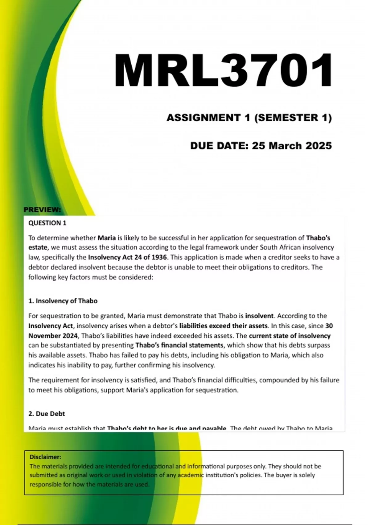 For sequestration to be granted, Maria must demonstrate that Thabo is insolvent. According to the