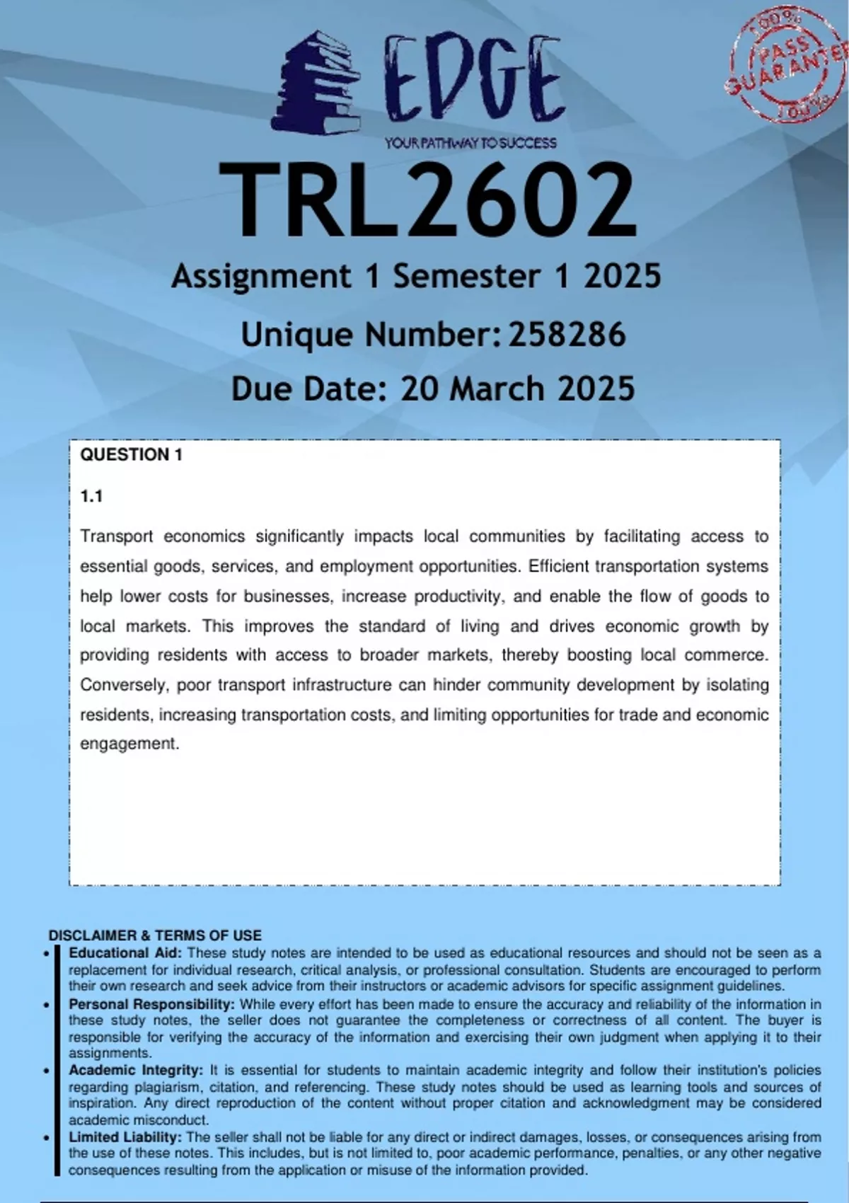 Achieve a distinction with this comprehensive and well-organized set of TRL2602 Assignment 1 (ANSWERS) Semester 1 2025 - DISTINCTION GUARANTEED. Ensure accuracy and excellence in your submission!!!! I QUESTION 1 1.1 Discuss how Transport Economics impacts the local communities. (5) 1.2 Discuss the economic concept of utility and indicate how the different types of utility in transport can contribute to a healthy competitive advantage. (10) 1.3 Briefly discuss the impact that increasing population numbers have on transportation planning. (5) 1.4. Describe the principal characteristics of transport demand. (10) TRL2601 TRL2603 TRL2604 TRL2605 TRL2605