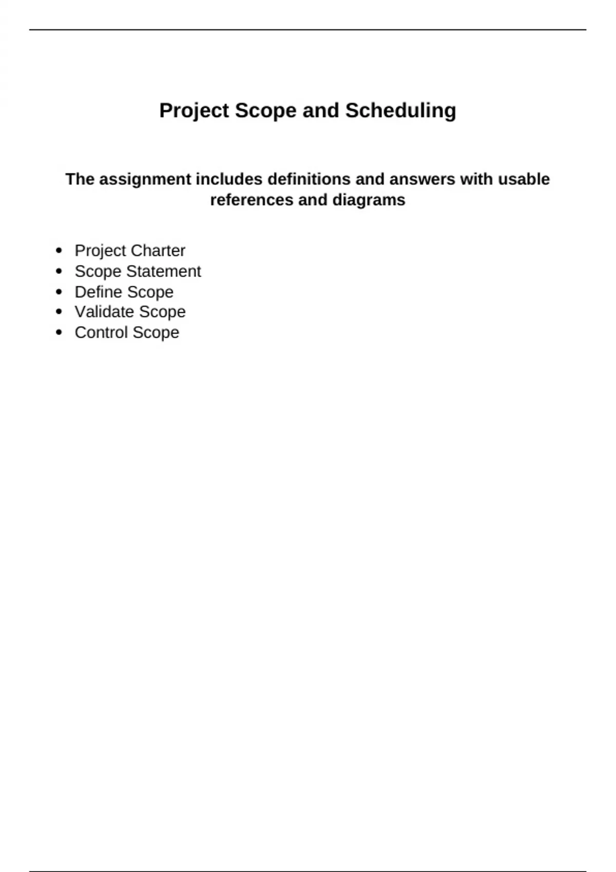 Project Scope and Scheduling The assignment includes definitions and answers with usable references and diagrams • Project Charter • Scope Statement • Define Scope • Validate Scope • Control Scope