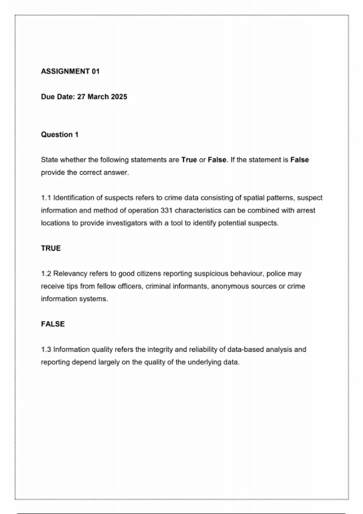 Due Date: 27 March 2025 Question 1 State whether the following statements are True or False. If the statement is False provide the correct answer. 1.1 Identification of suspects refers to crime data consisting of spatial patterns, suspect information and method of operation 331 characteristics can be combined with arrest locations to provide investigators with a tool to identify potential suspects. TRUE 1.2 Relevancy refers to good citizens reporting suspicious behaviour, police may receive tips from fellow officers, criminal informants, anonymous sources or crime information systems. FALSE