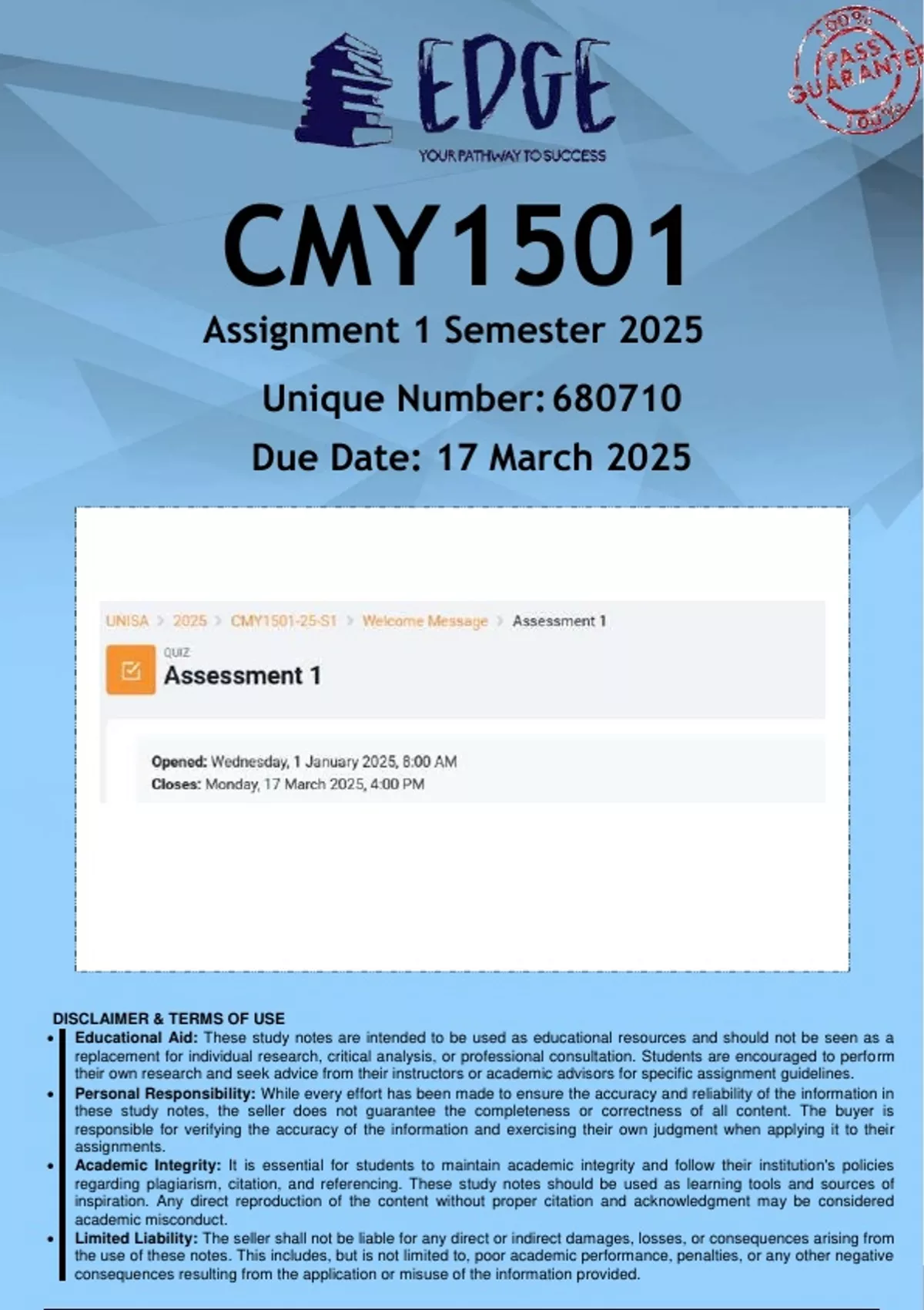 , UNISA 2025 CMY1501-25-S1 Welcome Message Assessment 1