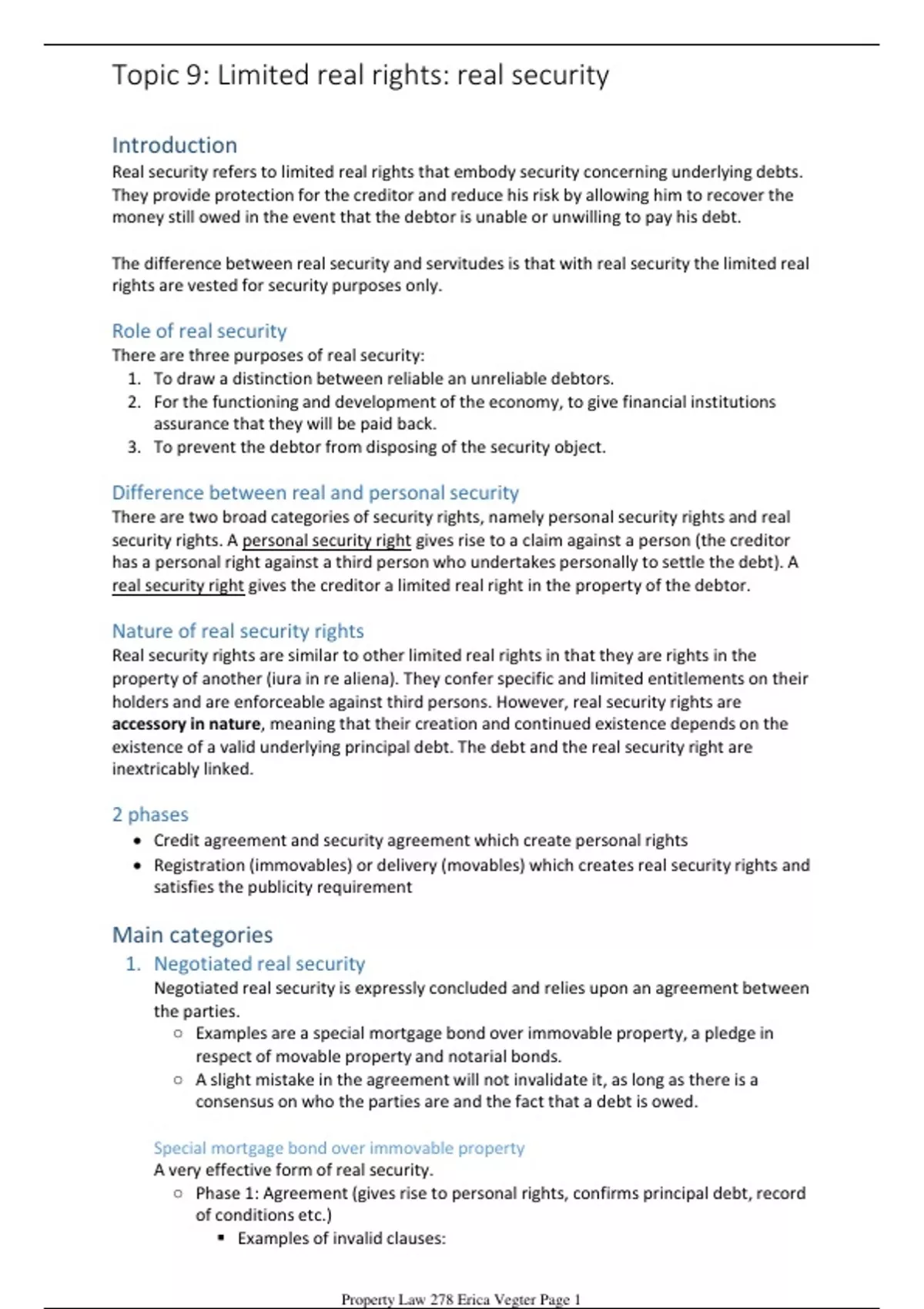 This document covers Topic 9&10 from the 2nd semester (Limited real rights: real security, and Constitutional property law and introduction to land reform). It is a combination of slides, textbook, class notes and cases. Very easy to follow and understand.