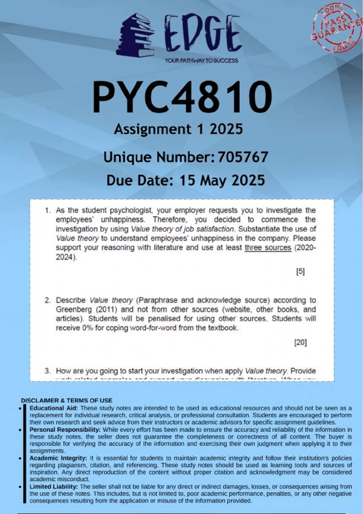 Well-structured PYC4810 Assignment 1 (ANSWERS) 2025 - DISTINCTION GUARANTEED. (DETAILED ANSWERS - DISTINCTION GUARANTEED!)..... 1. As the student psychologist, your employer requests you to investigate the employees’ unhappiness. Therefore, you decided to commence the investigation by using Value theory of job satisfaction. Substantiate the use of Value theory to understand employees’ unhappiness in the company. Please support your reasoning with literature and use at least three sources (). [5] 2. Describe Value theory (Paraphrase and acknowledge source) according to Greenberg (2011) and not from other sources (website, other books, and articles). Students will be penalised for using other sources. Students will receive 0% for coping word-for-word from the textbook. [20] 3. How are you going to start your investigation when apply Value theory. Provide work-related examples and support your discussion with literature. When you answer question 3, you are free to use any sources, except Artificial Intelligence (AI). You can use articles, books, websites, and other sources to support the discussion. Please use at least ten sources. The student that fails to cite the sources will get 0%. [30]