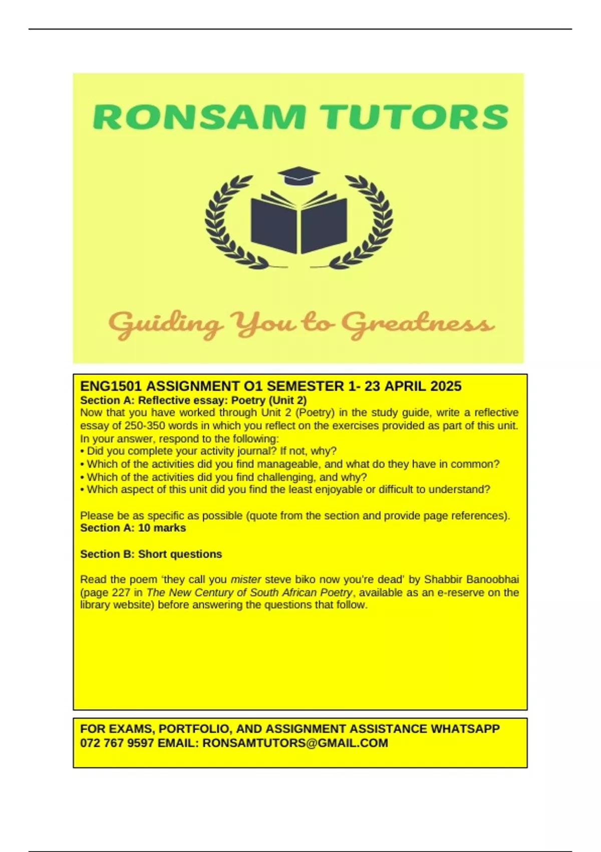 ENG1501– Assignment 01 Answers ( 23 APRIL 2025)- For expert assistance with assignments and exam preparation, contact 0/7/2/7/6/7/9/5/9/7. ASSIGNMENT 01: Poetry ‘they call you mister steve biko now you’re dead’ by Shabbir Banoobhai Due date: 23 April 2025 This assignment comprises TWO sections. Both sections are COMPULSORY. Section A: Reflective essay: Poetry (Unit 2) Now that you have worked through Unit 2 (Poetry) in the study guide, write a reflective essay of 250-350 words in which you reflect on the exercises provided as part of this unit. In your answer, respond to the following: • Did you complete your activity journal? If not, why? • Which of the activities did you find manageable, and what do they have in common? • Which of the activities did you find challenging, and why? • Which aspect of this unit did you find the least enjoyable or difficult to understand? Please be as specific as possible (quote from the section and provide page references). Section A: 10 marks We use the following as a rubric for marking the reflexive essay: Level Mark Range Descriptor Good 6-10 demonstration of engagement with the Study Guide using the given prompts Adequate 5 • generic response that skims the surface • poorly structured essay • response that is not always clear Inadequate 0-4 • AI-generated response • sourced response • unconvincing reflection Section B: Short questions Read the poem ‘they call you mister steve biko now you’re dead’ by Shabbir Banoobhai (page 227 in The New Century of South African Poetry, available as an e-reserve on the library website) before answering the questions that follow. You must answer in full sentences, and you should support your answers by quoting from the poem. Note: You will notice that each question includes a mark allocation. This is to indicate how much you should write to support your answer. One mark represents one main point or reason. If a question counts four marks, that means that you will need to supply four points or reasons. Remember that you can use an example from a poem only once; you cannot use the same example for each of your answers. 1. Consider the first stanza of the poem. 1.1 Comment on what the diction suggests about how Steve Biko was treated while he was alive. (2 marks) 1.2 Who is the “they” referred to here? (1 mark) 1.3 Who was Steve Biko, and why should he be remembered? (If you do not know and need to refer to online sources for this information, remember to reference your sources correctly!) (2 marks) 2. Refer to the title of the poem. 2.1 The title is repeated throughout. What is the effect of this in terms of the content and form of the poem? (2 marks) 2.2 In the title, the poet refers to Steve Biko as ‘mister’. How does this influence the reader’s perception of him? Consider instances when the title: “mister” is normally used. (2 marks) 3. Explore the use of irony in the poem. In your answer, consider the treatment of Steve Biko before and after his death. (3 marks) 4. How does the poet use imagery and symbolism to convey the idea of remembrance and legacy in the poem? (4 marks) 5. How does the poet create rhythm in the poem? (2 marks) 6. Refer to stanza 3. Lines 11-12 state that “the best advocate in the land/ was your voice”. Why is this ironic? (1 mark) 7. Identify the tone of the poem. Remember to justify your answer by referring to two examples. (4 marks) 8. This poem is an example of protest poetry. South Africa has a rich history of this type of poetry. Do you think this poem is effective as a protest poem? Explain. (2 marks) Section B: 25 marks GRAND TOTAL: 35 MARKS For information about correct quoting and referencing, consult Unit 1 of the Study Guide (Tutorial Letter 501). Warning! Using ideas and facts from other people, books or web pages without saying where they come from is the same as stealing those ideas and facts. This is plagiarism and it is a serious offence. If you are found guilty of plagiarism, you will fail this assignment.