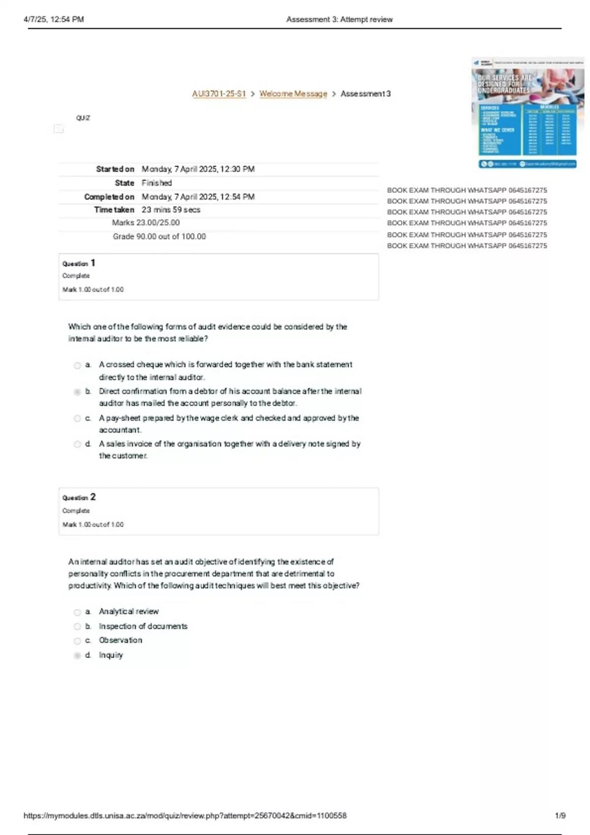 Grade 90.00 out of 100.00 BOOK EXAM THROUGH WHATSAPP 0645167275