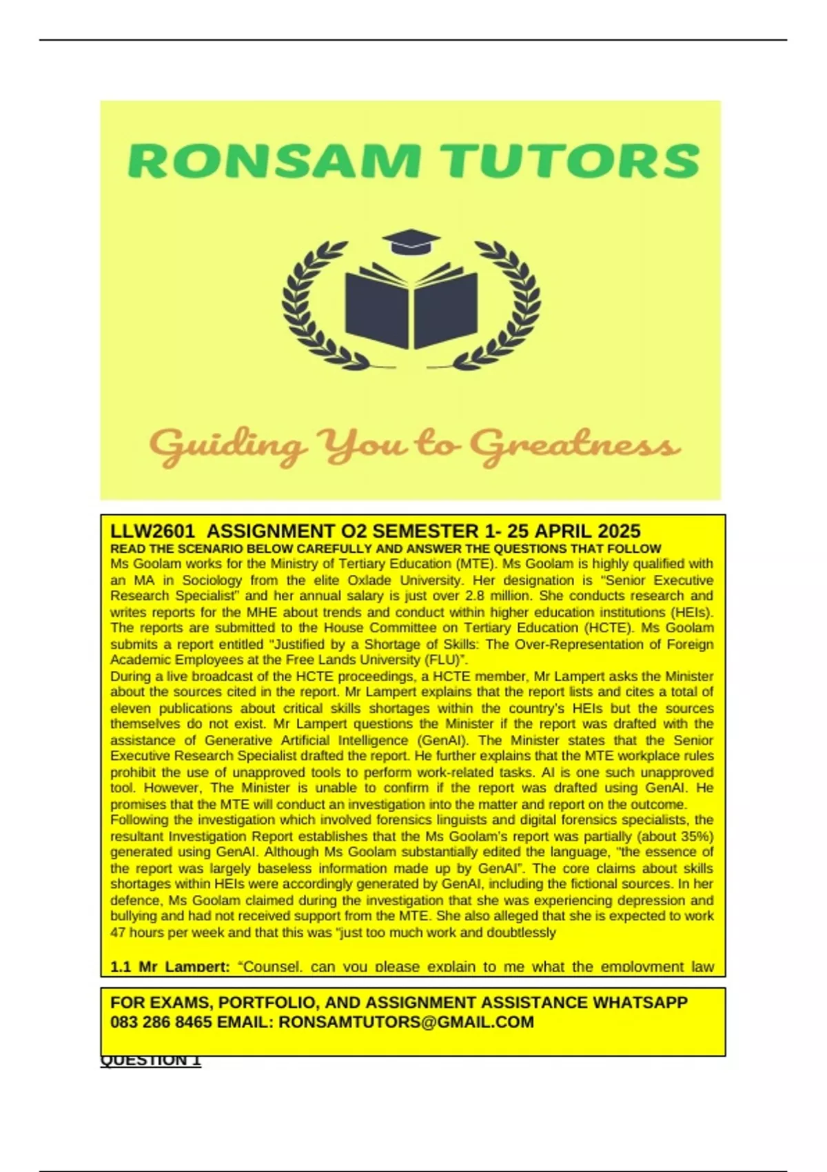 LLW2601– Assignment 02 Answers (25 APRIL 2025) QUESTION 1 READ THE SCENARIO BELOW CAREFULLY AND ANSWER THE QUESTIONS THAT FOLLOW Ms Goolam works for the Ministry of Tertiary Education (MTE). Ms Goolam is highly qualified with an MA in Sociology from the elite Oxlade University. Her designation is “Senior Executive Research Specialist” and her annual salary is just over 2.8 million. She conducts research and writes reports for the MHE about trends and conduct within higher education institutions (HEIs). The reports are submitted to the House Committee on Tertiary Education (HCTE). Ms Goolam submits a report entitled “Justified by a Shortage of Skills: The Over-Representation of Foreign Academic Employees at the Free Lands University (FLU)”. During a live broadcast of the HCTE proceedings, a HCTE member, Mr Lampert asks the Minister about the sources cited in the report. Mr Lampert explains that the report lists and cites a total of eleven publications about critical skills shortages within the country’s HEIs but the sources themselves do not exist. Mr Lampert questions the Minister if the report was drafted with the assistance of Generative Artificial Intelligence (GenAI). The Minister states that the Senior Executive Research Specialist drafted the report. He further explains that the MTE workplace rules prohibit the use of unapproved tools to perform work-related tasks. AI is one such unapproved tool. However, The Minister is unable to confirm if the report was drafted using GenAI. He promises that the MTE will conduct an investigation into the matter and report on the outcome. Following the investigation which involved forensics linguists and digital forensics specialists, the resultant Investigation Report establishes that the Ms Goolam’s report was partially (about 35%) generated using GenAI. Although Ms Goolam substantially edited the language, “the essence of the report was largely baseless information made up by GenAI”. The core claims about skills shortages within HEIs were accordingly generated by GenAI, including the fictional sources. In her defence, Ms Goolam claimed during the investigation that she was experiencing depression and bullying and had not received support from the MTE. She also alleged that she is expected to work 47 hours per week and that this was “just too much work and doubtlessly unlawful”. However, there is no record (whether in the form of emails, phone calls, surveillance footage etc) of Ms Goolam approaching the internal Employee Relations within the MTE about her depression or the alleged bullying. Furthermore, all executive-level staff within the Department are contractually obligated to a minimum of work 47 hours per week, which is said to be commensurate with their responsibilities and salaries. The Investigation Report (IR) and all associated documents are submitted to the HCTE. YOU are the legal practitioner appointed by the MTE to advise on legal matters within the Department and to represent the department before the HCTE on legal matters. You therefore are attending the HCTE Proceedings on behalf of the MTE. ANSWER THE QUESTIONS FROM THE HCTE MEMBERS BELOW: 1.1 Mr Lampert: “Counsel, can you please explain to me what the employment law consequence of Ms Goolam’s use of GenAI to draft the report is? (4) 2. HCTE Chairman: “Counsel, I can see that in one of the annexures to the IR, Ms Goolam suggests her resort to GenAI was because of the allegedly unreasonable working hours which she claims violate the law. Kindly tell me what law and legal provision(s) regulate working hours and explain if Ms Goolam’s claim is correct in terms of that law?” (4) 3. HCTE Deputy Chairwoman: “I am concerned, Counsel, that Ms Goolam claims to have experienced depression and bullying but the MTE did not address the issue. What does the law say about this issue, and can the MTE be found liable for this alleged failure?” (12) TOTAL MARKS: 20 MARKS