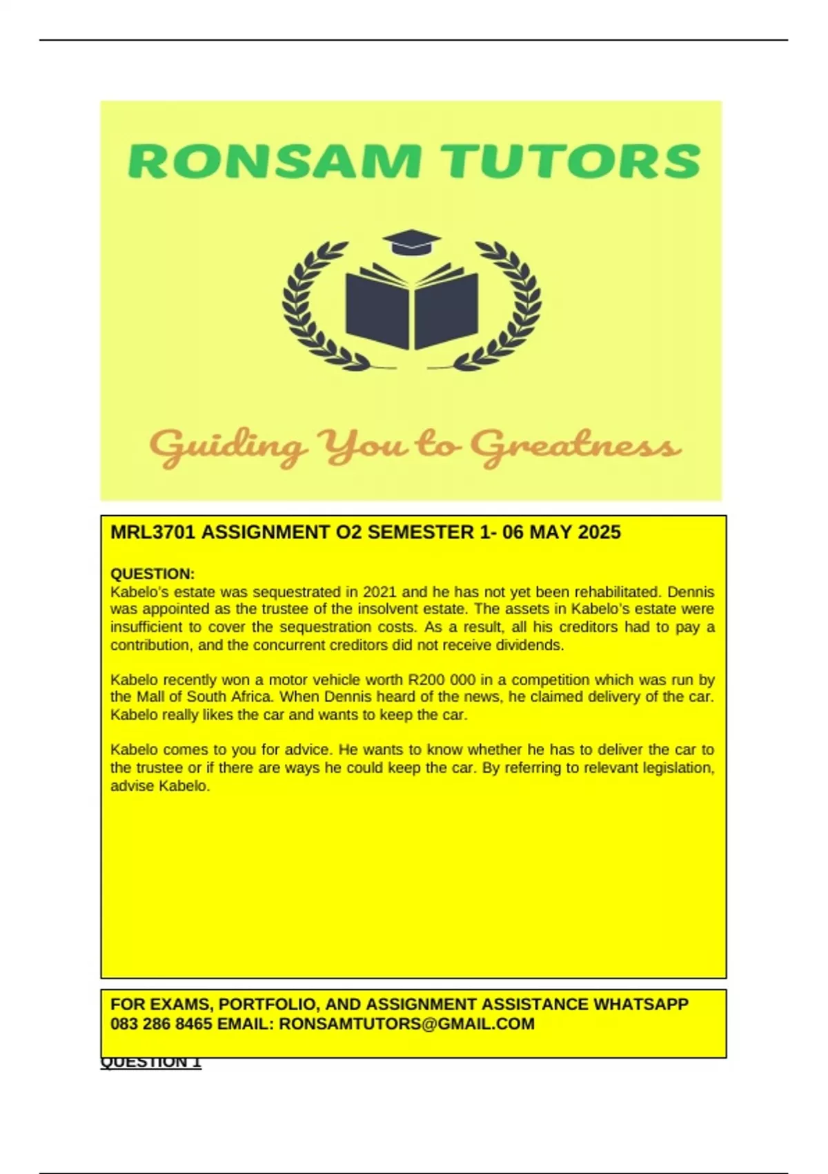 MRL3701– Assignment 02 Answers (06 May 2025) QUESTION: Kabelo’s estate was sequestrated in 2021 and he has not yet been rehabilitated. Dennis was appointed as the trustee of the insolvent estate. The assets in Kabelo’s estate were insufficient to cover the sequestration costs. As a result, all his creditors had to pay a contribution, and the concurrent creditors did not receive dividends. Kabelo recently won a motor vehicle worth R200 000 in a competition which was run by the Mall of South Africa. When Dennis heard of the news, he claimed delivery of the car. Kabelo really likes the car and wants to keep the car. Kabelo comes to you for advice. He wants to know whether he has to deliver the car to the trustee or if there are ways he could keep the car. By referring to relevant legislation, advise Kabelo.