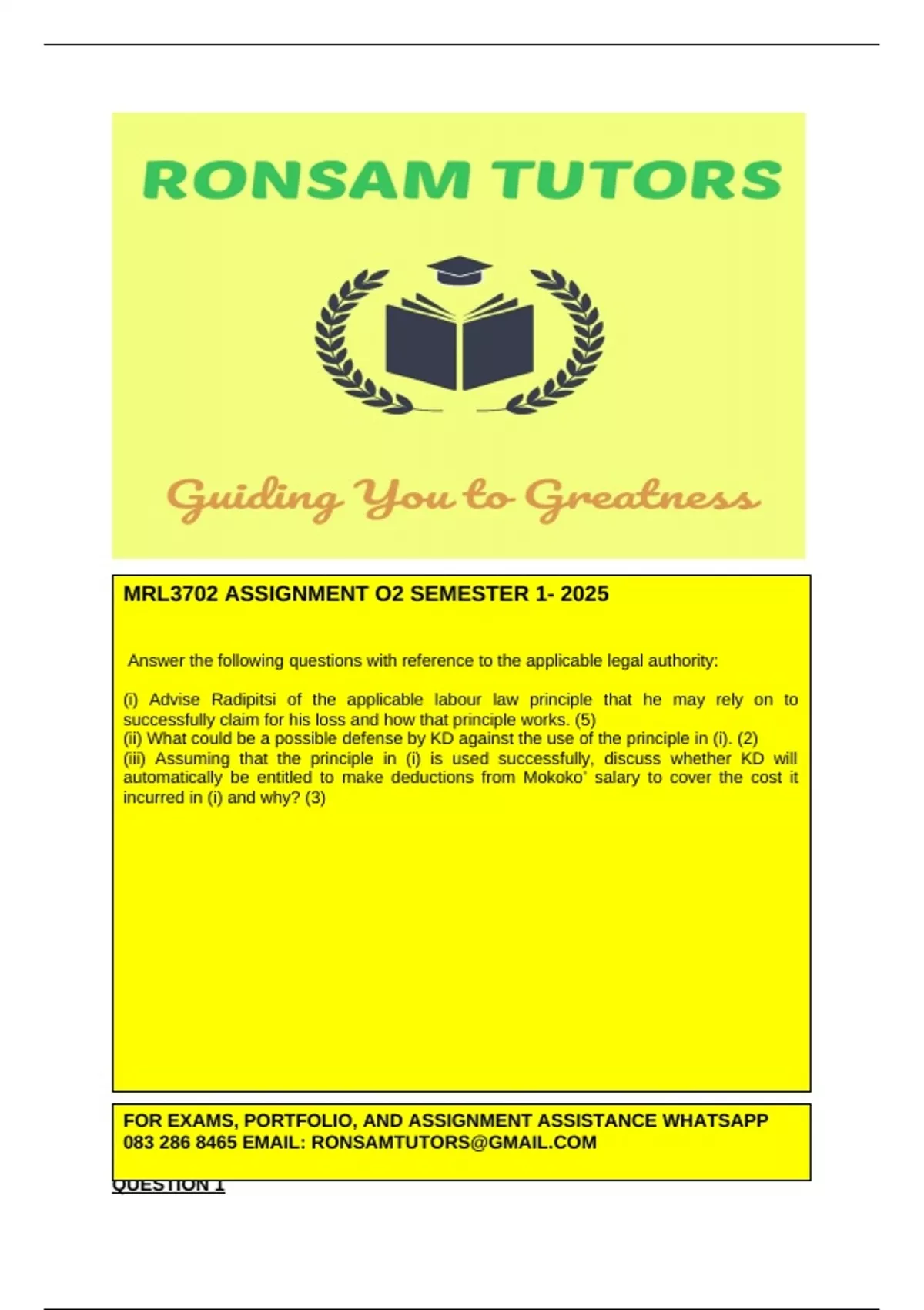 MRL3702– Assignment 02 Answers 2025- For expert assistance with assignments and exam preparation, contact 0/8/3/2/8/6/8/4/6/5. MRL3702 ASSISNMENT 2 S1 2025 Mokoko works for Ko-Diplaseng (Pty) Ltd (KD) as a truck driver. He loads and delivers potatoes to all branches of Mazimba Factories (MF) in South Africa. For long distances, KD would normally give Mokoko a petty cash to enable him to buy food to eat when he feels hunger, book a hotel room when he feels tired, and to proceed with a safe trip the following day when he is refreshed. One day as Mokoko was on his way to deliver potatoes from Pretoria to Cape Town he noticed a lady with ababy on her back walking alongside the road between two remote towns. Out of sympathy, Mokoko stopped and gave the lady a lift. When they got to the next town, dusk had fallen, and he decided to take a fifteen kilometers detour, just to make sure that the lady and her baby arrived safely at home. Due to poor lighting in the village, Mokoko could not see a donkey cart entering the road and he hit it. As a result, the truck and the cart were damaged and the legs of the two donkeys which pulled the cart, were broken. A veterinarian report indicated that the donkeys would no longer be of any use because of their injuries. The owner of the cart, a 58 years old, Radipitsi who is unemployed and relied on cart services he offered to the locals to survive, wants the truck driver to pay the cost of both the damaged cart and injured donkeys to the value of R150 000.00. Radipitsi has lost a source of his income and Mokoko is not in a position to compensate Radipitsi. Answer the following questions with reference to the applicable legal authority: (i) Advise Radipitsi of the applicable labour law principle that he may rely on to successfully claim for his loss and how that principle works. (5) (ii) What could be a possible defense by KD against the use of the principle in (i). (2) (iii) Assuming that the principle in (i) is used successfully, discuss whether KD will automatically be entitled to make deductions from Mokoko’ salary to cover the cost it incurred in (i) and why? (3) [10]