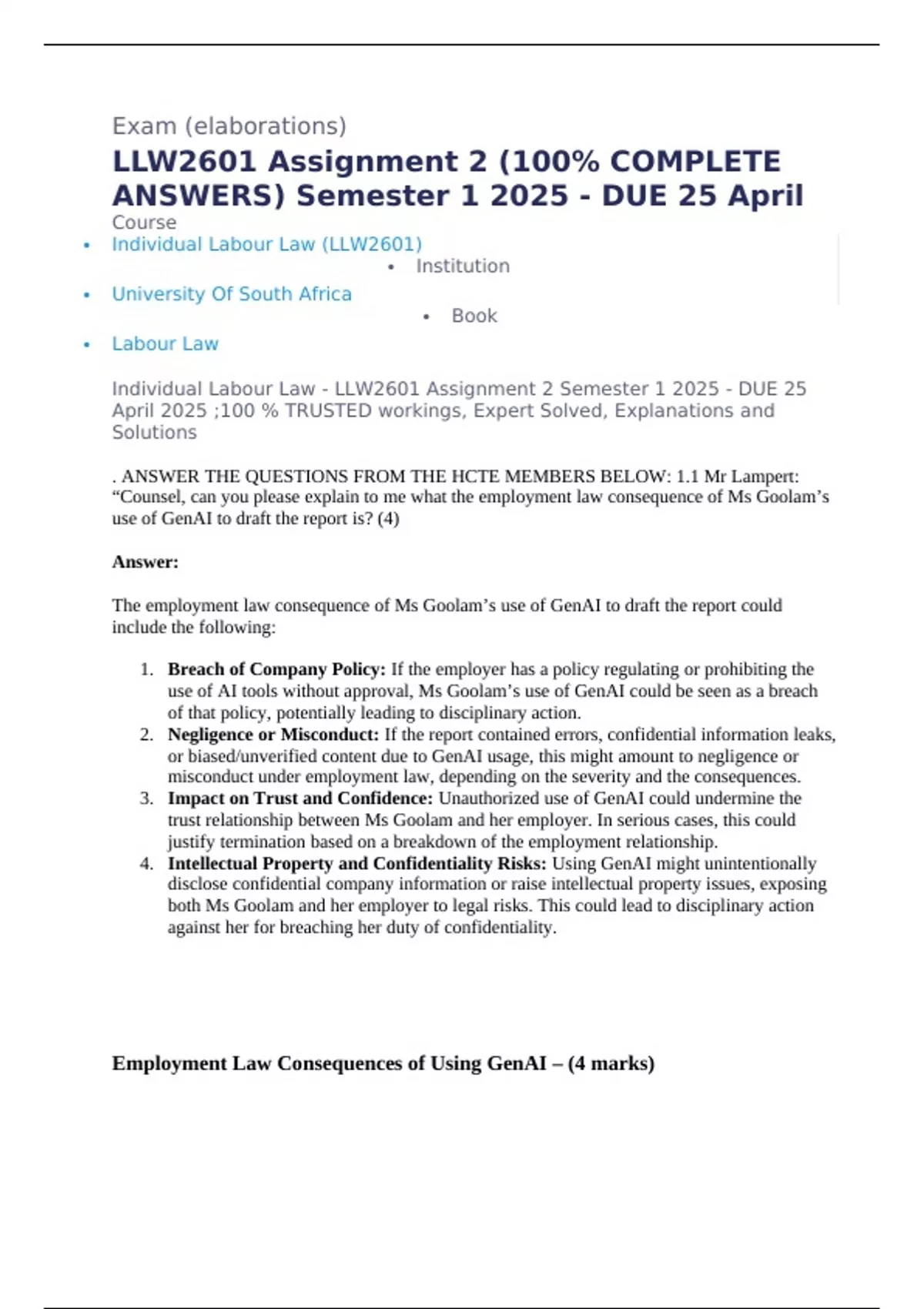 Individual Labour Law - LLW2601 Assignment 2 Semester 1 2025 - DUE 25