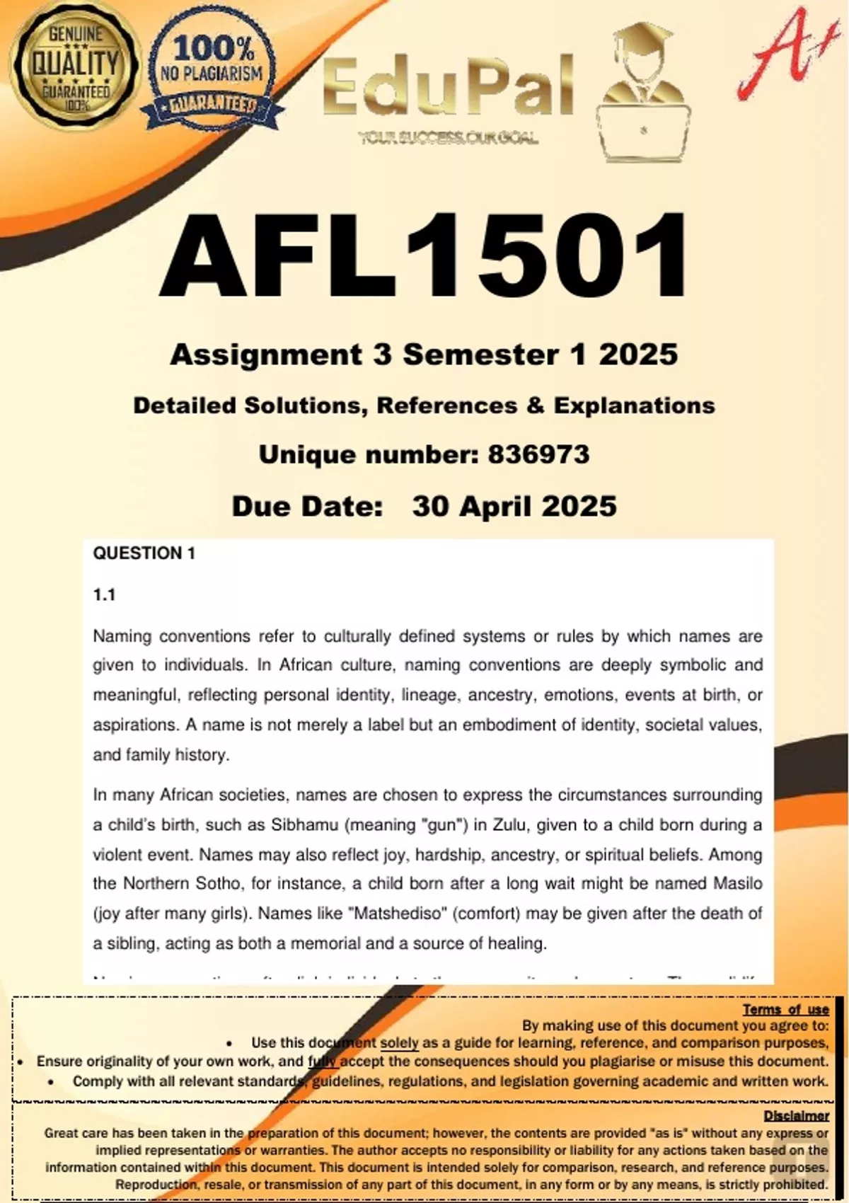 AFL1501 Assignment 3 (COMPLETE GUIDELINE) Semester 1 2025 (836973) - DUE 30 April 2025; 100% TRUSTED Complete, trusted solutions and explanations. For assistance, Whats-App 0.6.7-1.7.1-1.7.3.9. Ensure your success with us....
