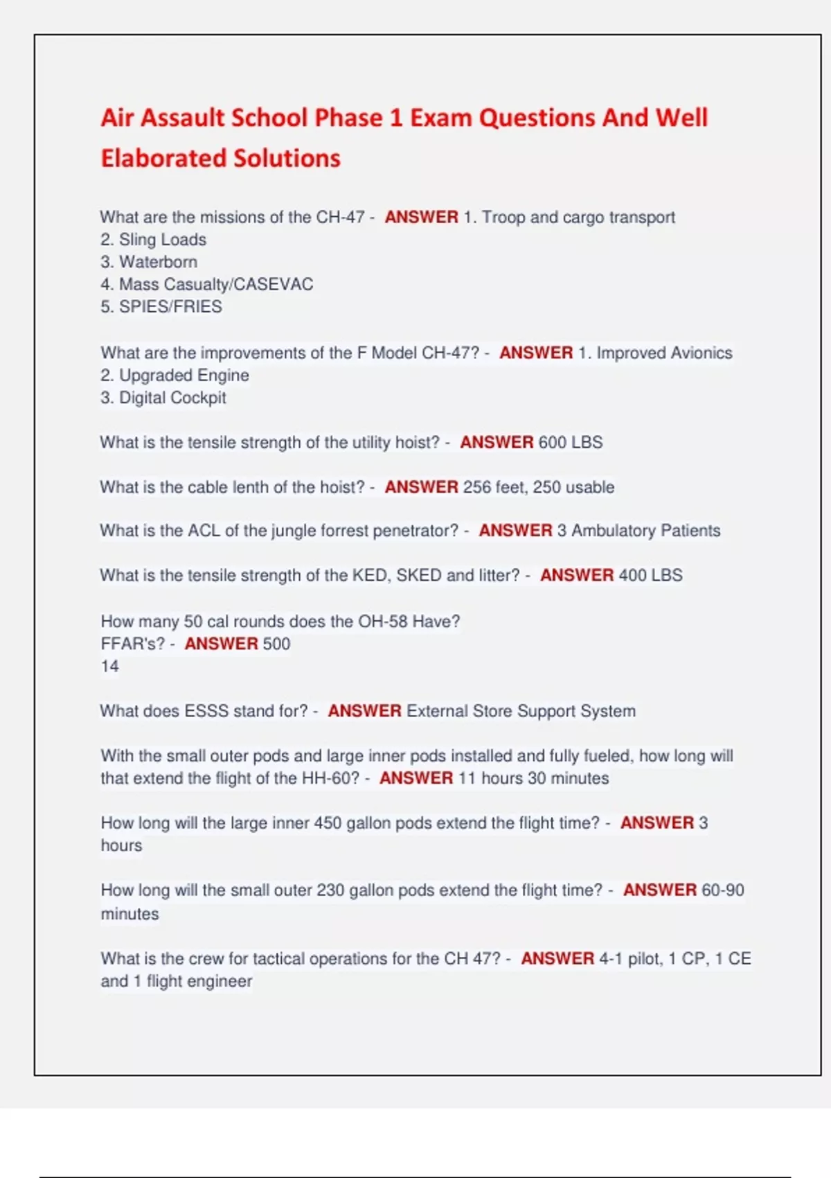 Air Assault School Phase 1 Exam Questions And Well Elaborated Solutions What are the missions of the CH-47 - ANSWER 1. Troop and cargo transport 2. Sling Loads 3. Waterborn 4. Mass Casualty/CASEVAC 5. SPIES/FRIES What are the improvements of the F Model CH-47? - ANSWER 1. Improved Avionics 2. Upgraded Engine 3. Digital Cockpit What is the tensile strength of the utility hoist? - ANSWER 600 LBS What is the cable lenth of the hoist? - ANSWER 256 feet, 250 usable What is the ACL of the jungle forrest penetrator? - ANSWER 3 Ambulatory Patients What is the tensile strength of the KED, SKED and litter? - ANSWER 400 LBS How many 50 cal rounds does the OH-58 Have? FFAR's? - ANSWER 500 14 What does ESSS stand for? - ANSWER External Store Support System With the small outer pods and large inner pods installed and fully fueled, how long will that extend the flight of the HH-60? - ANSWER 11 hours 30 minutes How long will the large inner 450 gallon pods extend the flight time? - ANSWER 3 hours How long will the small outer 230 gallon pods extend the flight time? - ANSWER 60-90 minutes What is the crew for tactical operations for the CH 47? - ANSWER 4-1 pilot, 1 CP, 1 CE and 1 flight engineer What is the definition of MASCAL? - ANSWER Any large number of casualties produced in a short amount of time that exceeds unit support capabilities. What are the two patient classifications? - ANSWER Litter and ambulatory How many red cross markings are on a UH-1 - ANSWER 4 What is the ACL of the UH-1? - ANSWER 3 litters and 4 ambulatory with prior notification, 6 litters and 9 ambulatory How many red cross markings are on the HH-60? - ANSWER 5 What is the ACL of the CH 47 - ANSWER 24 litters and one ambulatory or 31 ambulatory What 3 items must you have in your possesion at all times? - ANSWER ID Card, ID Tags and Earplugs What are the crash positions for the UH 60? - ANSWER Upright Muzzle Down What are the crash positions for the CH 47? - ANSWER Bend forward at the waist, muzzle down. How many emergency exits are on the UH 60? - ANSWER 4 How many emergency exits are on the CH 47? - ANSWER All windows What is the definition of CASEVAC? - ANSWER MVMT of casualties aboard non- medical vehicles or aircraft. How many red cross markings are on a CH47 - ANSWER 0 What is the patient loading sequence for a UH 60? - ANSWER 90 degree rotating litter support system counterclockwise. The SKED has how many handles? - ANSWER 4 the KEDS has how many staps? - ANSWER 7 what is line 6 on the medevac request in combat or peacetime? - ANSWER Combat- security of site Peacetime-# and types of wounds What is the only line that may be omitted if the threat does not exist on the 9 line? - ANSWER Line 9 NBC Contamination What is the definition of air assault operations? - ANSWER operations in which air assault forces(combat, CS and CSS) using firepower, mobility, and total integration of helicopter assets in their ground or air roles, manouver on the battlefield under the control of the ground and air MVMT CDR to engage and destroy enemy forces or to seize and hold key terrain. What are the limitations of Air Assault Operations? - ANSWER 1. Adverse Weather 2. PZ/LZ Availability 3. Initial reliance on air re-supply and lines of commo 4, High fuel and ammo consumption 5. Reduced ground mobility after insertion What is the lowest level of assetts for an air assault operation? - ANSWER Division Level What is the nucleus of the air assault task force? - ANSWER Infantry What is the mission of the AH 64 - ANSWER 1. Anti-armor 2. Close air support 3. Recon 4. Air to air combat What is H-Hour? - ANSWER The time the first A/C of the first lift touches down on the LZ. What are the three terrain flight modes? - ANSWER Nap of the earth, contour, and low level Define bump plan - ANSWER Key personell and equipment not left on PZ and arrive on LZ first Define Load/Chalk and is there a difference? - ANSWER Personnel or equipment designated to be moved by a specific A/