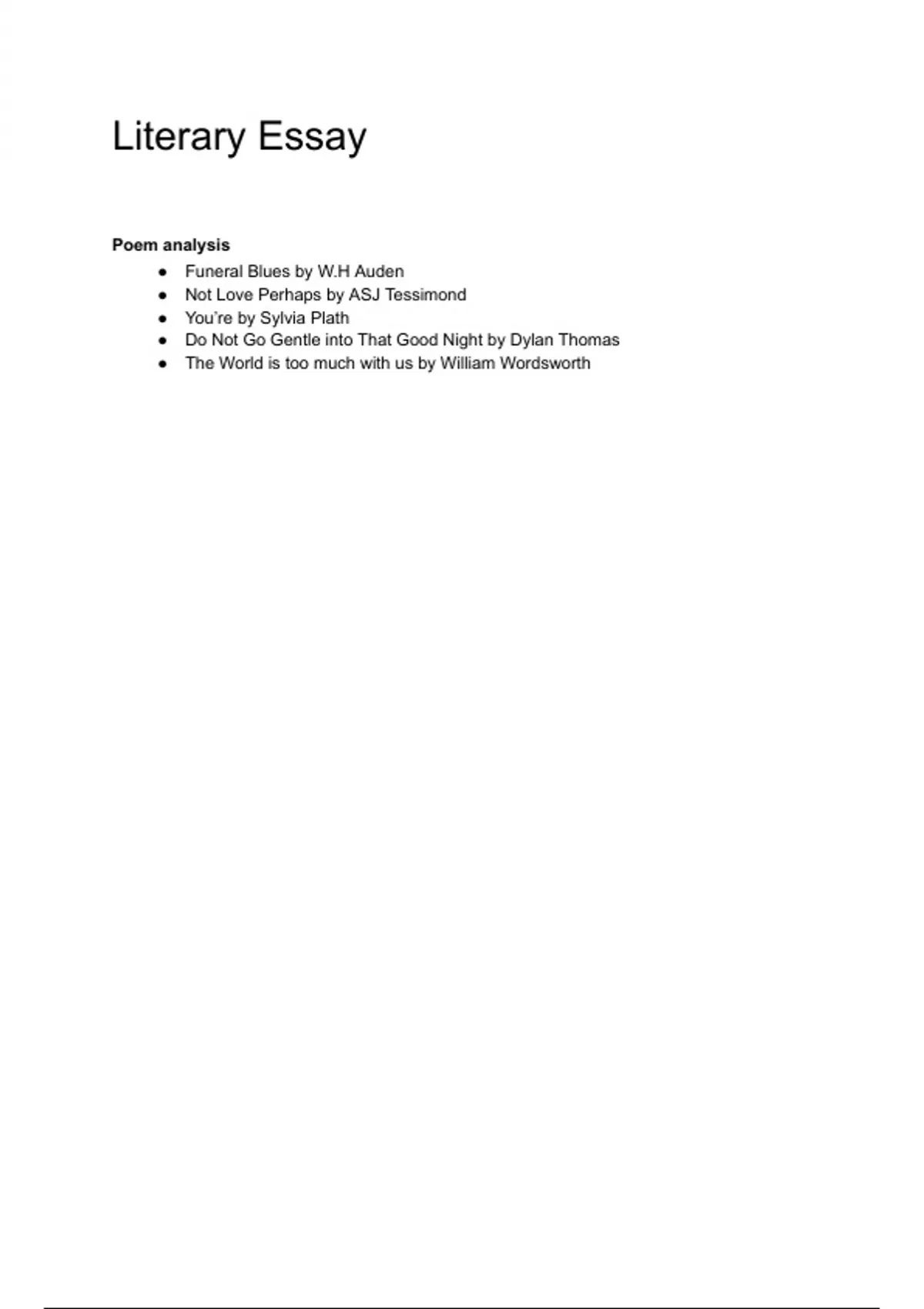 This document offers an in-depth literary analysis of several iconic poems, each with its own distinct exploration of themes such as grief, mortality, love, identity, and humanity's relationship with nature. The analysis includes detailed examinations of works by renowned poets such as W.H. Auden, Dylan Thomas, A.S.J. Tessimond, Sylvia Plath, and William Wordsworth. By delving into aspects like diction, imagery, tone, emotion, and themes, the document provides a comprehensive understanding of the poet's techniques and the emotional and intellectual responses they elicit in readers. Key Themes Explored: Grief and Mourning: In "Funeral Blues" by W.H. Auden, the poem vividly portrays the all-encompassing sorrow of losing a loved one. Auden’s use of commanding tone and rich imagery highlights the speaker's desperate desire to halt time and prevent life from continuing in the face of death. The raw emotion and powerful diction emphasize the profound nature of the speaker's grief. Defiance Against Death: Dylan Thomas’s "Do Not Go Gentle into That Good Night" offers a compelling exploration of death and the fight against it. Through vivid imagery and a tone that oscillates between defiance and resignation, Thomas urges his father to resist the inevitable darkness of death. The poem underscores the tension between life’s vitality (symbolized by light) and the finality of death (symbolized by darkness). The Complexity of Love: A.S.J. Tessimond's "Not Love Perhaps" questions conventional ideas of love, presenting relationships as multifaceted and often ambiguous. The poem’s introspective tone and deliberate diction force readers to reconsider their assumptions about love, intimacy, and human connection. Personal Identity and Self-Perception: Sylvia Plath’s "You're" offers a deep and surreal exploration of identity. The speaker uses imaginative and often unsettling imagery to explore the fluid nature of self-perception, offering insights into the insecurities and contradictions inherent in personal identity. Humanity’s Disconnect from Nature: William Wordsworth’s "The World is Too Much with Us" critiques the materialism of the modern world and humanity’s estrangement from nature. Wordsworth laments this spiritual impoverishment and calls for a reconnection with nature, urging readers to reflect on their own relationship with the environment. Conclusion: Each poem in this document is meticulously analyzed, shedding light on the technical and emotional depth of the works. The careful examination of diction, imagery, tone, and emotion not only enriches the understanding of the poems but also offers readers an invitation to engage more deeply with the complexities of human experience. This document serves as an invaluable resource for anyone looking to gain a more nuanced understanding of poetry and its power to reflect the most profound aspects of life.