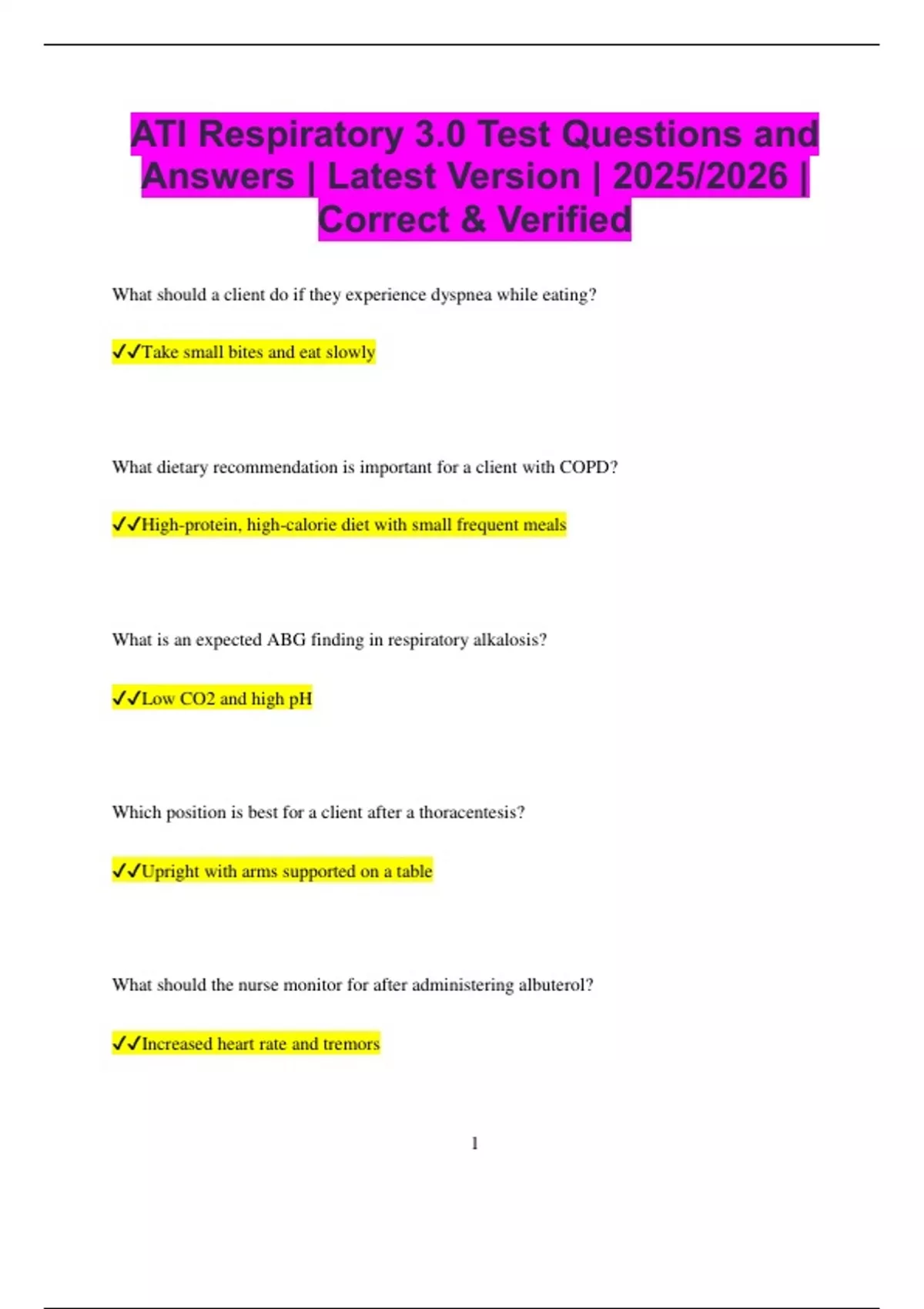 ATI Respiratory 3.0 Test Questions and Answers | Latest Version | 2025/2026 | Correct & Verified What should a client do if they experience dyspnea while eating? Take small bites and eat slowly What dietary recommendation is important for a client with COPD? High-protein, high-calorie diet with small frequent meals What is an expected ABG finding in respiratory alkalosis? Low CO2 and high pH Which position is best for a client after a thoracentesis? Upright with arms supported on a table What should the nurse monitor for after administering albuterol? Increased heart rate and tremors 2 Which symptom suggests a pneumothorax after chest trauma? Sudden shortness of breath with absent breath sounds on one side What is the priority action when a client experiences hemoptysis? Assess the amount and source of bleeding and notify the provider Which intervention helps prevent aspiration pneumonia? Elevating the head of the bed during meals What is the purpose of a pulse oximeter? To measure peripheral oxygen saturation noninvasively Why should a client with COPD avoid high-carbohydrate diets? Carbohydrates increase CO2 production, worsening respiratory distress What is the hallmark sign of acute respiratory distress syndrome (ARDS)? Severe hypoxia that does not improve with oxygen therapy 3 What should be avoided when suctioning a tracheostomy? Applying suction while inserting the catheter Why is smoking cessation crucial for clients with chronic bronchitis? It reduces mucus production and airway inflammation What is the priority nursing intervention for a client with anaphylaxis? Administer epinephrine immediately What should be included in discharge teaching after a lobectomy? Use of an incentive spirometer to prevent lung collapse Why should a client with a history of pulmonary embolism avoid prolonged sitting? To reduce the risk of deep vein thrombosis (DVT) What is the first nursing action when a client experiences sudden shortness of breath? Elevate the head of the bed and assess oxygen saturation 4 What breath sound is expected in a client with an acute asthma attack? Wheezing What is the best position for a client experiencing respiratory distress? High Fowler’s position What should the nurse assess before applying oxygen therapy? Respiratory rate, lung sounds, and