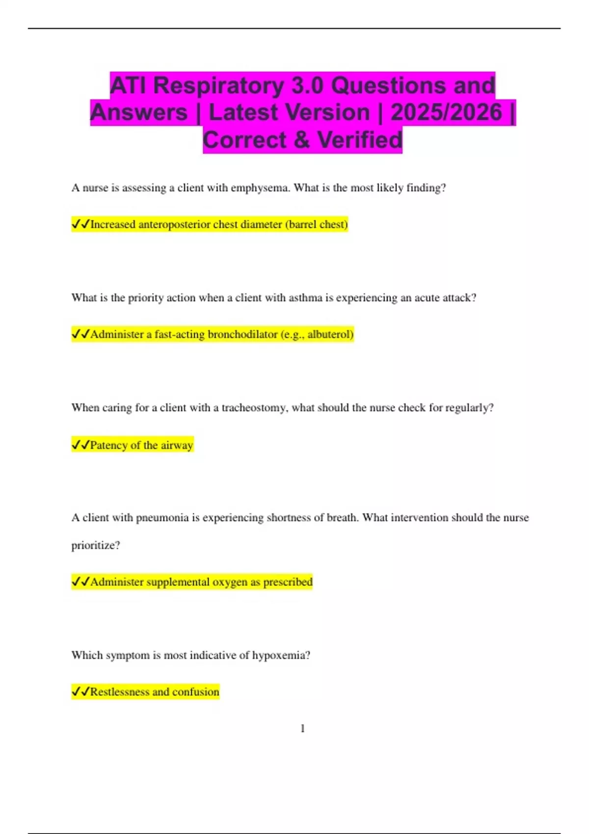 ATI Respiratory 3.0 Questions and Answers | Latest Version | 2025/2026 | Correct & Verified A nurse is assessing a client with emphysema. What is the most likely finding? Increased anteroposterior chest diameter (barrel chest) What is the priority action when a client with asthma is experiencing an acute attack? Administer a fast-acting bronchodilator (e.g., albuterol) When caring for a client with a tracheostomy, what should the nurse check for regularly? Patency of the airway A client with pneumonia is experiencing shortness of breath. What intervention should the nurse prioritize? Administer supplemental oxygen as prescribed Which symptom is most indicative of hypoxemia? Restlessness and confusion 2 A nurse is caring for a client receiving oxygen therapy. What is the most important safety instruction? Ensure that oxygen is kept away from open flames or heat sources What is a common side effect of the bronchodilator albuterol? Tachycardia A client is receiving continuous positive airway pressure (CPAP) therapy. What is the nurse's priority action? Ensure the mask fits securely to prevent air leakage What is the most appropriate nursing intervention for a client with a pneumothorax? Prepare for chest tube insertion to re-expand the lung A nurse is assessing a client’s breath sounds. What finding is most consistent with chronic obstructive pulmonary disease (COPD)? Wheezing and diminished breath sounds 3 What is the first step in managing a patient who has a suspected pulmonary embolism? Administer oxygen therapy to improve oxygenation What should the nurse monitor closely in a client with a chest tube? The water seal chamber for fluctuations (tidaling) A nurse is preparing to teach a client with asthma about using a peak flow meter. What is the key point to emphasize? The client should use the peak flow meter daily and record the results A client with tuberculosis is receiving drug therapy. What should the nurse teach the client about medication adherence? Complete the full course of antibiotics as prescribed, even if symptoms improve What is the priority intervention for a client experiencing severe dyspnea from an asthma attack? Administer a short-acting beta-agonist (SABA)