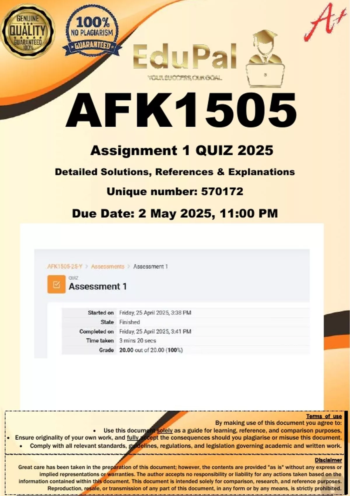 AFK1505 Assignment 1 (COMPLETE GUIDELINE) 2025 - DUE 2 May 2025; 100% TRUSTED Complete, trusted solutions and explanations. For assistance, Whats-App 0.6.7-1.7.1-1.7.3.9. Ensure your success with us....