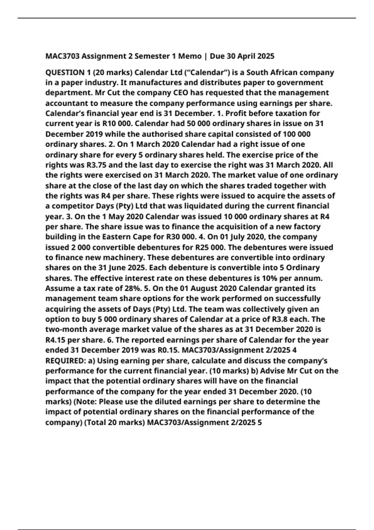 QUESTION 1 (20 marks) Calendar Ltd (“Calendar”) is a South African company