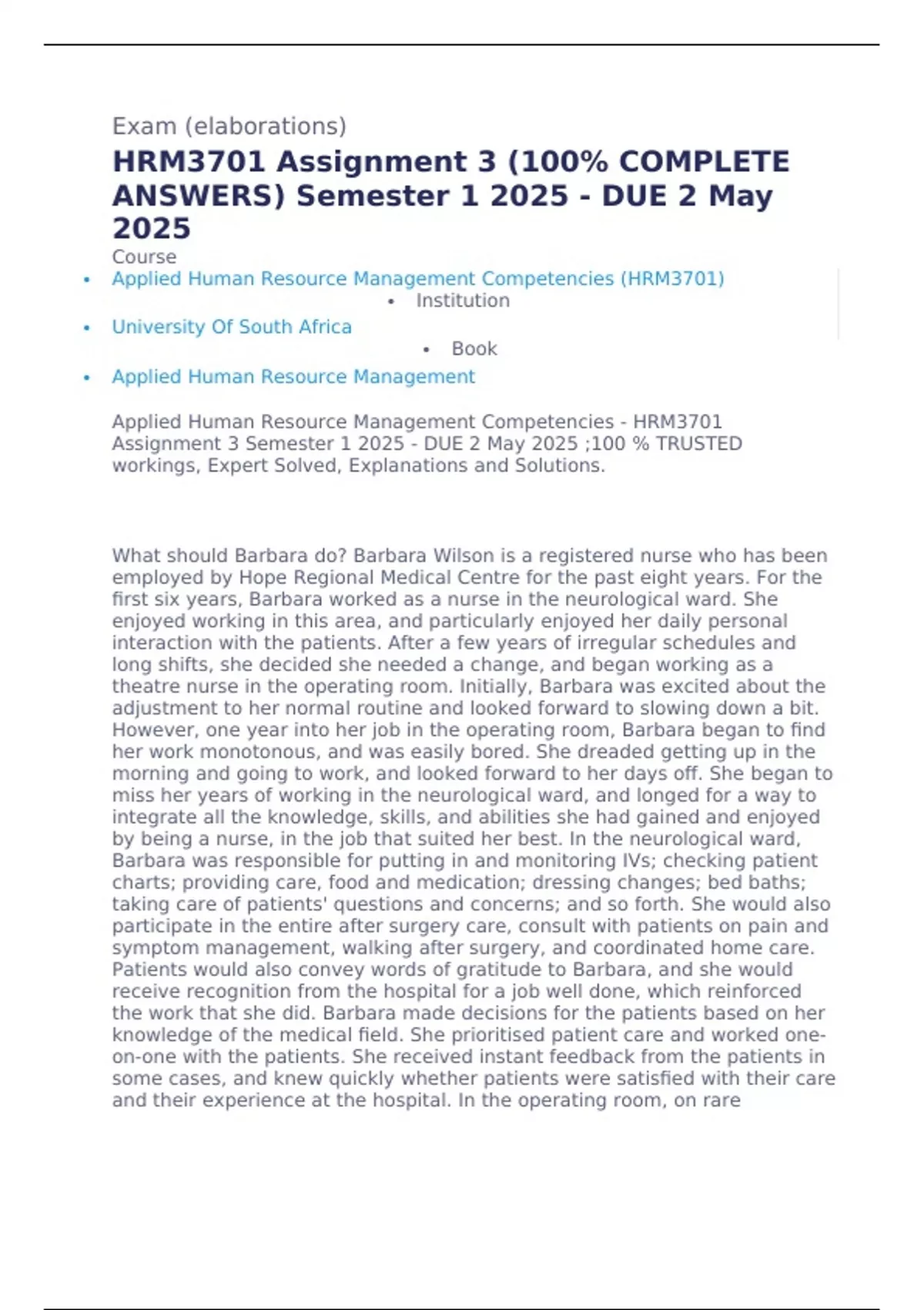 Applied Human Resource Management Competencies - HRM3701 Assignment 3 Semester 1 2025 - DUE 2 May 2025 ;100 % TRUSTED workings, Expert Solved, Explanations and Solutions.