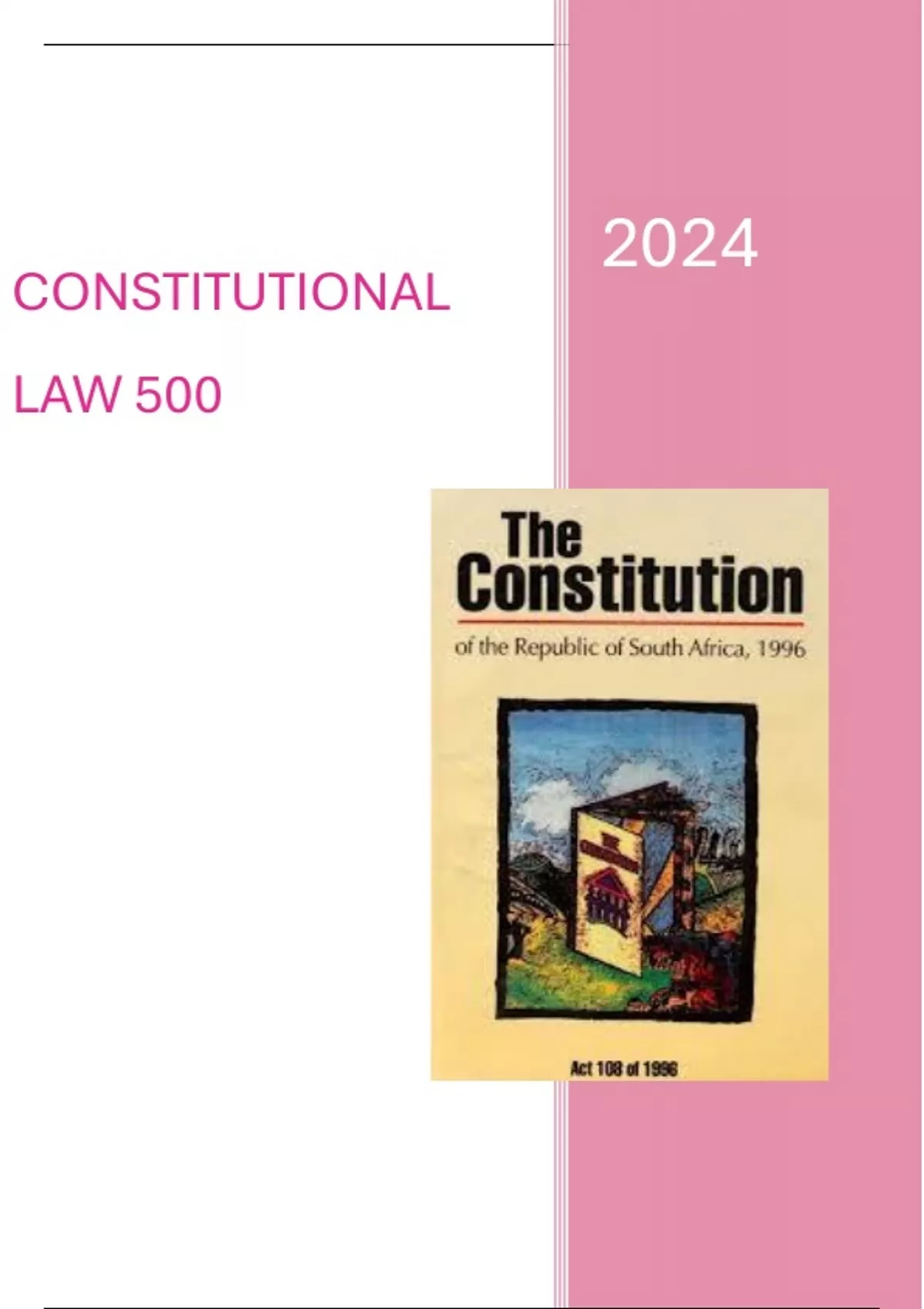 Received a distinction for this module. Illustrated, in-depth and easy to understand constitutional law summaries on the following topics: Constitutional history and basic constitutional principles; Separation of powers structures of the South African government. Bill of Beneficiaries, Justiciability, rights litigation: Duty-Bearers, Jurisdiction, Interpretation, Remedies.