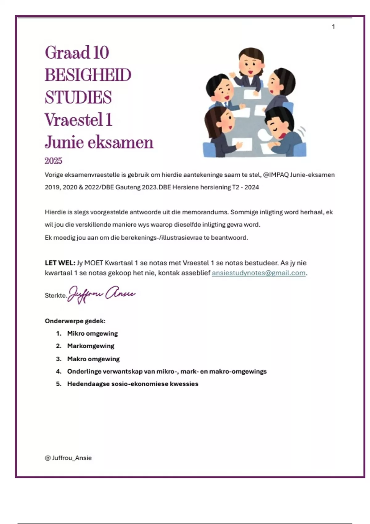 Onderwerpe gedek: 1. Mikro omgewing 2. Markomgewing 3. Makro omgewing 4. Onderlinge verwantskap van mikro-, mark- en makro-omgewings 5. Hedendaagse sosio-ekonomiese kwessies Vorige eksamenvraestelle is gebruik om hierdie aantekeninge saam te stel, @IMPAQ Junie-eksamen 2019, 2020 & 2022/DBE Gauteng 2023.DBE Hersiene hersiening T2 - 2024