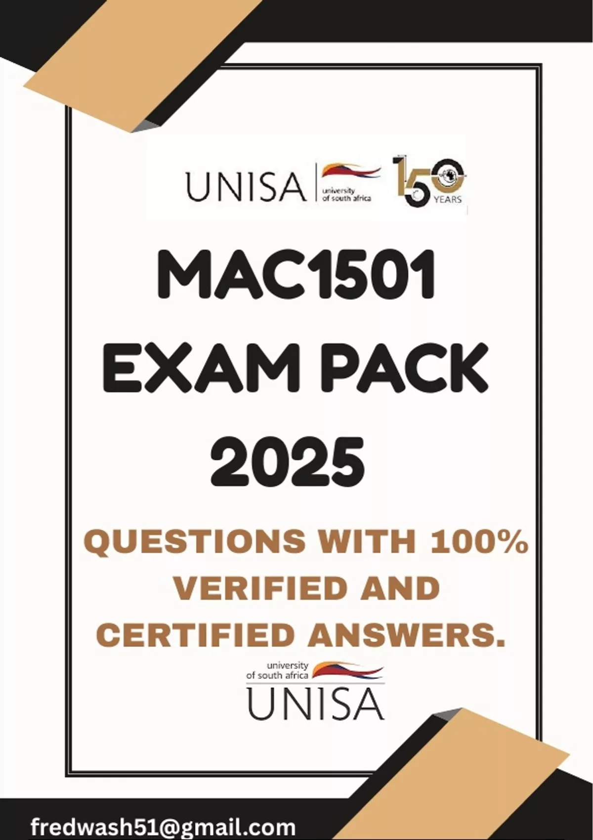 MAC1501 EXAM PACK 2025 (FROM MAY/JUN 2023 – OCT/NOV 2024) QUESTIONS WITH RESPECTIVE ANSWERS, CREATED FOR EXAM REVISION FROM RECENT PAST EXAM QUESTIONS. FOLLOW MY PROFILE FOR VAST REVISION MATERIALS. PAST PAPERS, PRESCRIBED BOOKS AND TUTORIAL LETTERS. CHECK MY PROFILE AND SEARCH FOR ANY UNIT, e.g., ENG1503