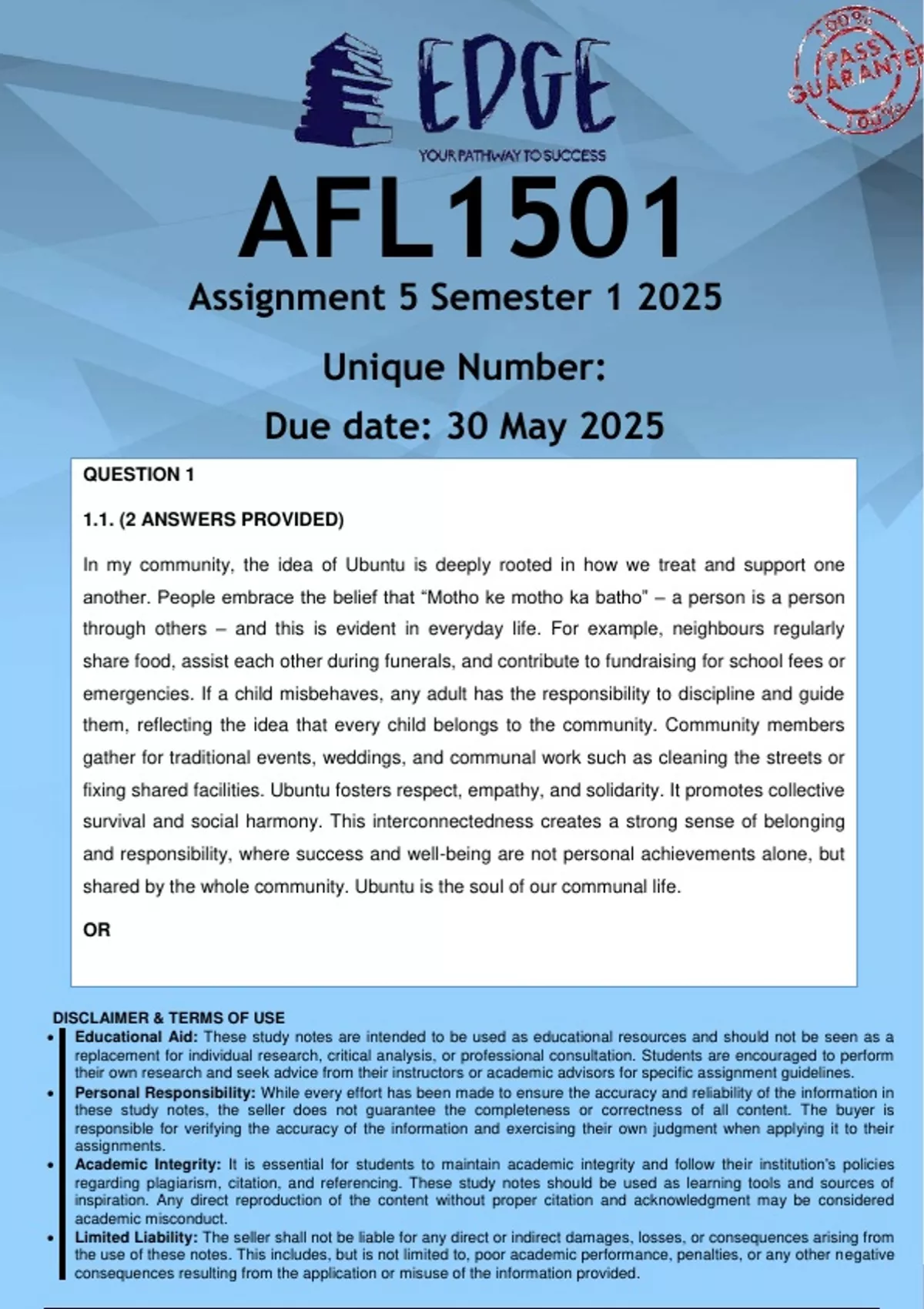 Well-structured AFL1501 Assignment 5 (ANSWERS) Semester 1 2025 - DISTINCTION GUARANTEED. (DETAILED ANSWERS - DISTINCTION GUARANTEED!)... 1.1 Think about your personal experiences of living in a community. In what ways does the idea of Ubuntu shape how people in your community treat and help one another? 1.2 Describe a situation you have seen or been part of where people made peace after a disagreement. How does making up show the values of Ubuntu? 1.3 In your own words, explain the main values that make up the spirit of Ubuntu. Give two real-life examples of how you've seen these values in action in your daily life. 1.4 Recall a story shared in your family or community, like one about an important event, tradition, or lesson from elders. How does this story help preserve your community's history and shape how people see their identity today?Explain how your family background (clan, ancestry, or family traditions) has shaped your cultural identity. How do names, traditions/rituals, or daily practices help define who you are? Think of any proverbs or riddles you heard while growing up. How do these sayings help teach right from wrong or guide people's behaviour in your community? Use examples to explain your answer. Consider how Ubuntu has shaped how people in your community treat strangers or offer help, kindness, or support. Give specific examples of when you've seen this spirit in action.