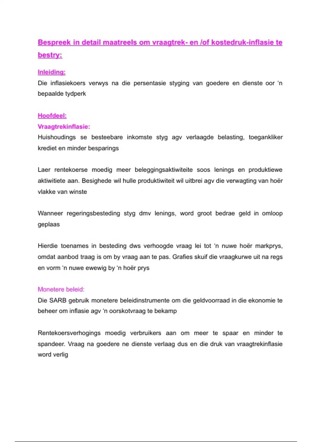 Bespreek in detail maatreels om vraagtrek- en /of kostedruk-inflasie te