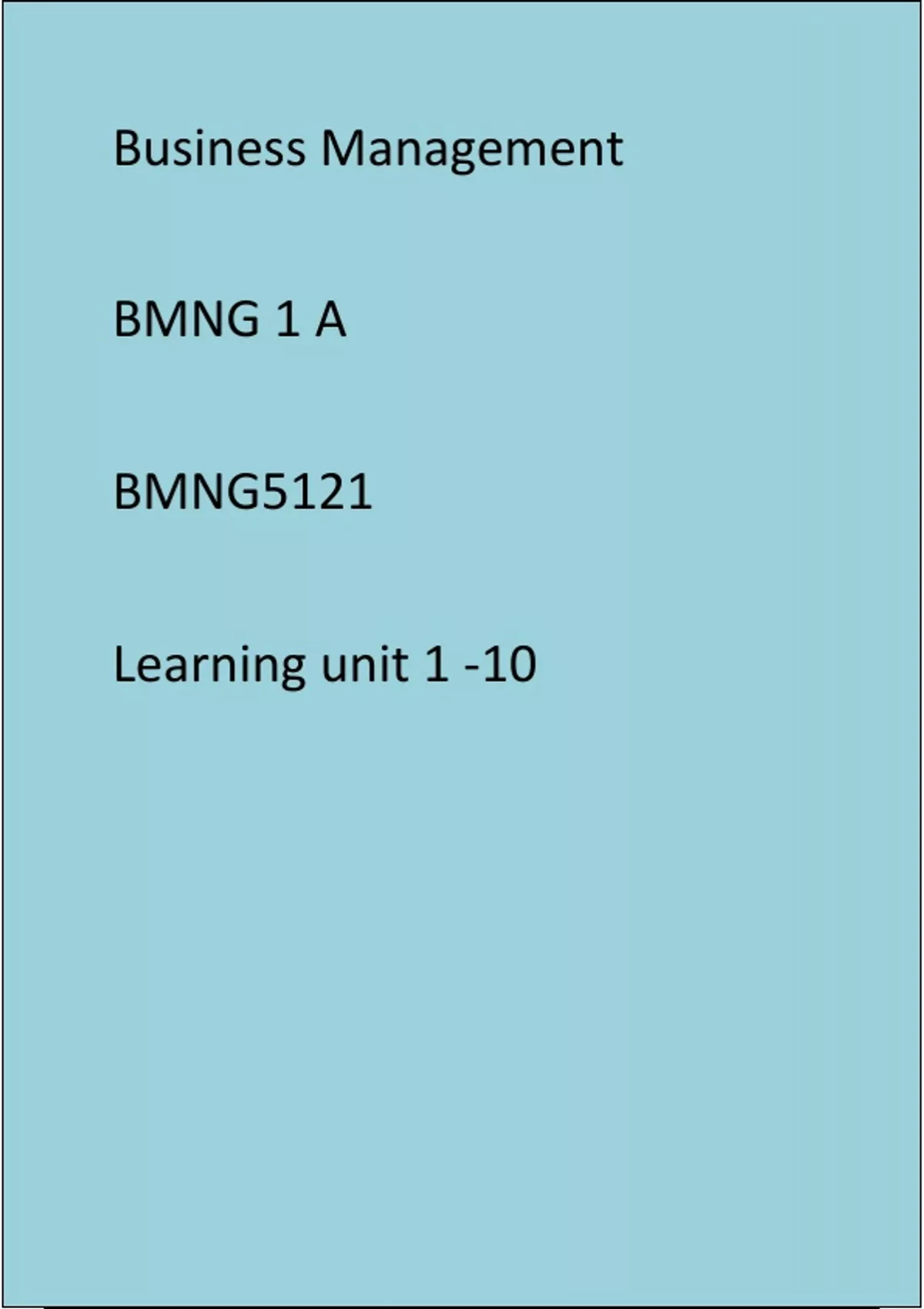 LU1 -Business & Society Lu2 - Entrepreneurship LU3- Establishing a Business LU4- The Business Environment LU5- Corporate Social Responsibility LU6- Introduction to General Management LU7- Planning LU8- Organizing LU9- Leading LU10- Controlling
