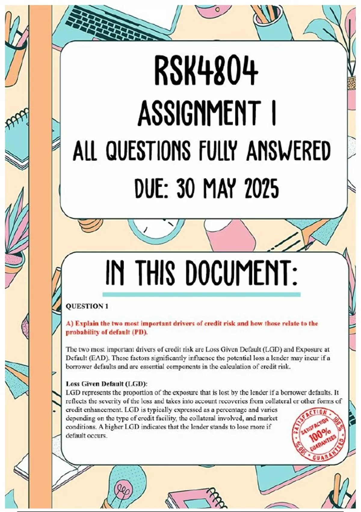 RSK4804 Assignment 1 Memo | Due 30 May 2025. All questions fully answered. Question 1 [10] a. Explain the two most important drivers of credit risk and how those relate to the probability of default (PD). (5) b. As head of credit risk at Daspoort Investment Bank, you are considering approval of a five-year credit asset (business term loan) with a bullet (balloon) repayment at the end of a term. The term loan shows a marginal probability of default of 1.3%, 1.5%, 1.2%, 1.7%, and 2.2% for each of the five years, respectively. How would you find the cumulative probability of default over the five-year period for pricing purposes? Question 2 [10] The Merton model, which was proposed in 1974 by economist Robert C. Merton, is a mathematical formula that stock analysts and commercial loan officers, among others, can use to judge a corporation’s risk of credit default and ability to retain solvency. This model assesses the structural credit risk of a company by modeling its equity as a call option on its assets. With the above statement in mind, the current value of the assets of Sibasa Agricultural Holdings is R130 million. The assets are financed by a mix of equity and zero-coupon debt. The current value of the zero-coupon debt is R75 million, and the final amount to be paid on maturity after five years is R120 million, with an effective interest rate of 13.25%. The volatility in Sibasa Agricultural Holdings’ asset value is 23%. The following is required: a. Compute the probability of default (PD) of Sibasa Agricultural Holdings based on the Merton model. (5) b. What is the impact on probability of default (PD) if the volatility suddenly decreases to 21%? (5) Question 3 [15] Internal rating systems deployed by banks and financial institutions differ from organisation to organisation. As a potential future credit risk analyst, you are required to identify a local or international financial (lending) institution or a retailer who extends credit facilities to new and existing clients. Your focus must include but not be limited to the following: - • Understanding of the organisation’s internal rating systems • A process that has been put in place • Decision to deny or approve a credit line to a customer • How the credit quality of a client’s portfolio is maintained Document your visit/call and provide feedback relating to your findings. Conditions: (a) Physical visit to the entity or telephonic contact is a must – originality is required. Also, it is mandatory to provide the name of the company (organisation), place, business type, name of the person interviewed, and the date. (b) Any “cut and paste” from resources will not attract marks. Question 4 (15) In credit assessment, Porter’s Five Forces Model is a tool that can be used to give insight into forces that affect the revenue and profitability of a business. As a credit analyst for Meadowbank Limited, use the Porter’s Model to assess the potential, in terms of performance, of a company of your choice, locally or internationally, in sectors of retail, automotive, aviation, and food services. You can begin by giving a brief background of the company and the sector of operation. TOTAL MARKS: 50