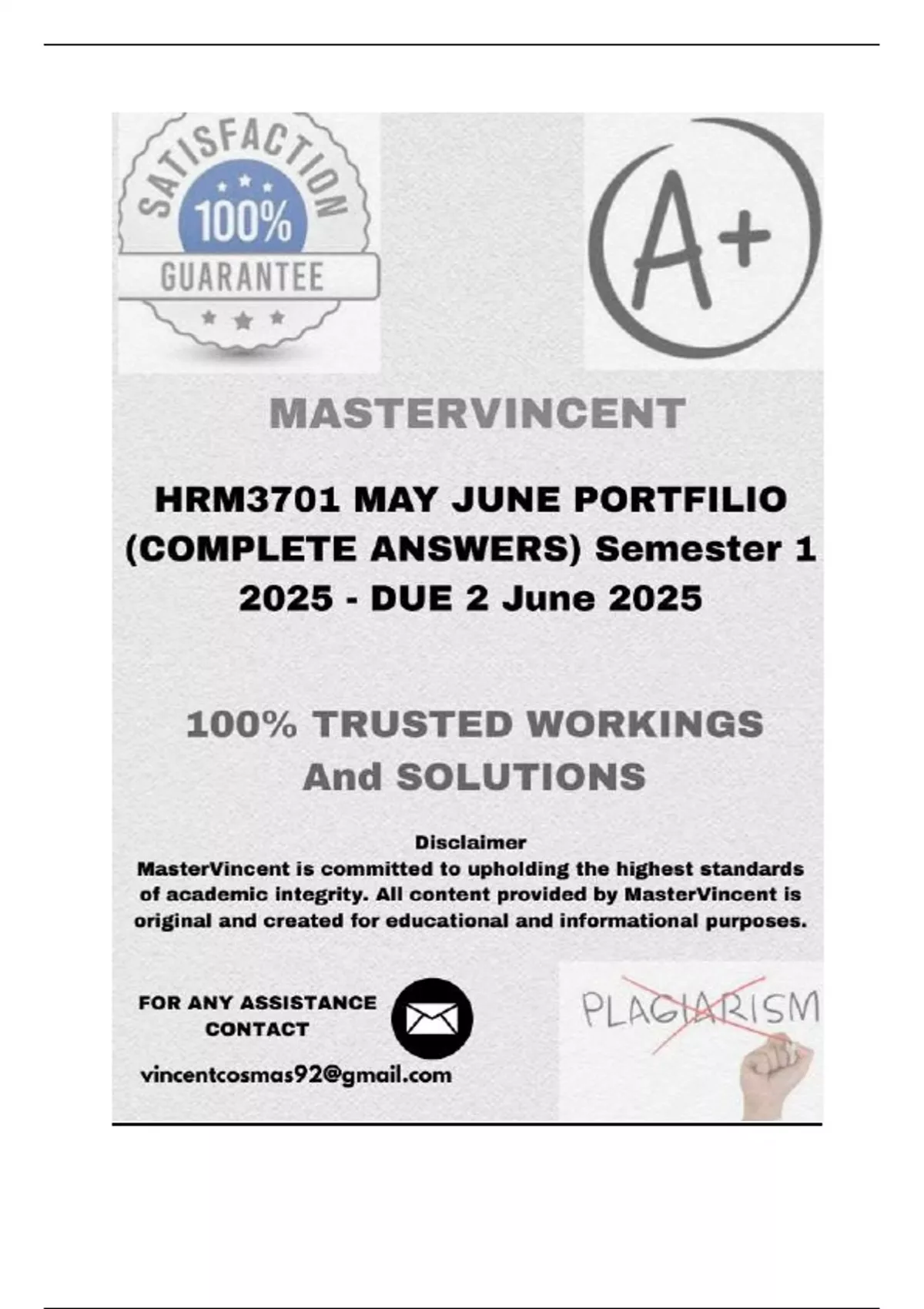 HRM3701 MAY JUNE PORTFILIO (COMPLETE ANSWERS) Semester 1 2025 - DUE 2 June 2025; 100% correct solutions and explanations.