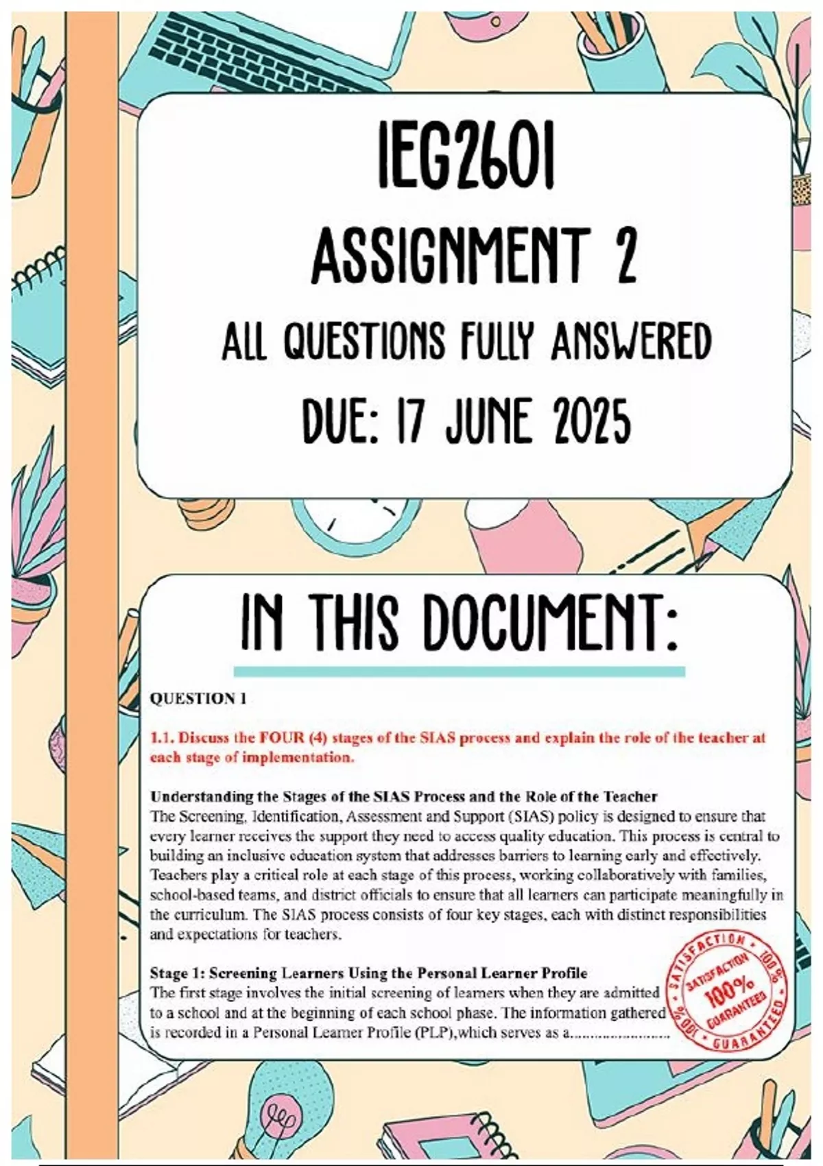IEG2601 Assignment 2 Memo | Due 17 June 2025. All questions fully answered. QUESTION 1: (35) The Screening, Identification, Assessment and Support (SIAS) policy is structured in such a way that it ensures that teachers and schools understand the support needs of all learners to enhance the delivery of the National Curriculum and Assessment Policy Statement (Department of Basic Education, 2011). 1.1 Discuss the FOUR (4) stages of the SIAS process and explain the role of the teacher at each stage of implementation. [4x4] (16) 1.2 Discuss THREE (3) types of information that should be included in a learner’s profile and substantiate the importance of schools maintaining these profiles. (8) 1.3 Justify the essential need for parents to disclose their child's educational and health challenges upon school enrolment. (5) 1.4 For learners to achieve better outcomes, parents and teachers must share a common vision for the child. Discuss what you will take into account and how you will engage parents and guardians to develop an individualised learning programme for a child with special needs in your Grade R classroom. QUESTION 2: (30) Examine the image and answer the questions that follow. 2.1 Identify the type of motor development portrayed in the image and explain four ways in which this activity can benefit children’s development. (10) 2.2 Suggest TWO (2) ways the teacher can adapt the activity to include learners with physical disabilities to achieve the same outcome. Keep your suggestions original. [2x5] (10) 2.3 Examine and discuss TWO (2) roles of the teacher in ensuring the safety and supervision of children during these activities. [2x5] (10) QUESTION 3: (35) Read the case study and answer the questions that follow. Vusi's teacher has assigned him an activity that involves sorting small colourful buttons by size and colour into separate containers. Vusi will have completed the activity once all the buttons are organised in their respective containers. While visiting the classroom, Vusi’s dad notices him sitting at a table, focused on sorting the small buttons, and questions the teacher, thinking that Vusi is simply playing. The teacher explains that this activity is designed to help Vusi develop his fine motor skills and colour recognition. She further elaborates that after sorting, Vusi will engage in a counting activity where he will practice counting the buttons he sorted. 3.1 Evaluate TWO (2) roles of parents in supporting inclusive education and expanding their children’s learning. [2x3] (6) 3.2 Explain why you think Vusi’s dad believed that Vusi was engaged in an unnecessary activity. (5) 3.3 Provide THREE (3) reasons why it is important for parents to understand that teachers use different strategies to prepare and develop learners for acquiring specific skills. [3x2] (6) 3.4 Justify FOUR (4) skills that the activity Vusi’s teacher assigned to him will help him develop. [4x3] (12) 3.5 Design TWO (2) additional activities that Vusi’s teacher could use to assist him in enhancing the intended skills. Keep your ideas original. [2x3] (6) TOTAL: [100]
