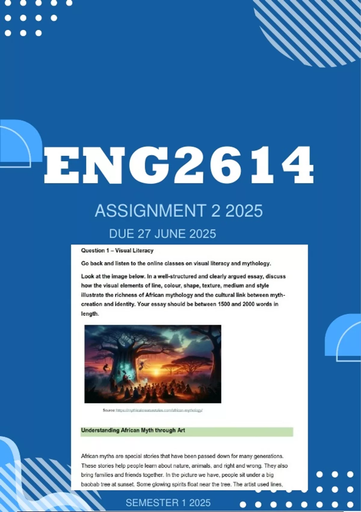 ENG: Assignment 2 Due date: 27 June 2025 at 23:00 Visual Literacy and Myth Question 1 – Visual Literacy Go back and listen to the online classes on visual literacy and mythology. Look at the image below. In a well-structured and clearly argued essay, discuss how the visual elements of line, colour, shape, texture, medium and style illustrate the richness of African mythology and the cultural link between mythcreation and identity. Your essay should be between 1500 and 2000 words in length. Understanding African Myth through Art African myths are special stories that have been passed down for many generations.