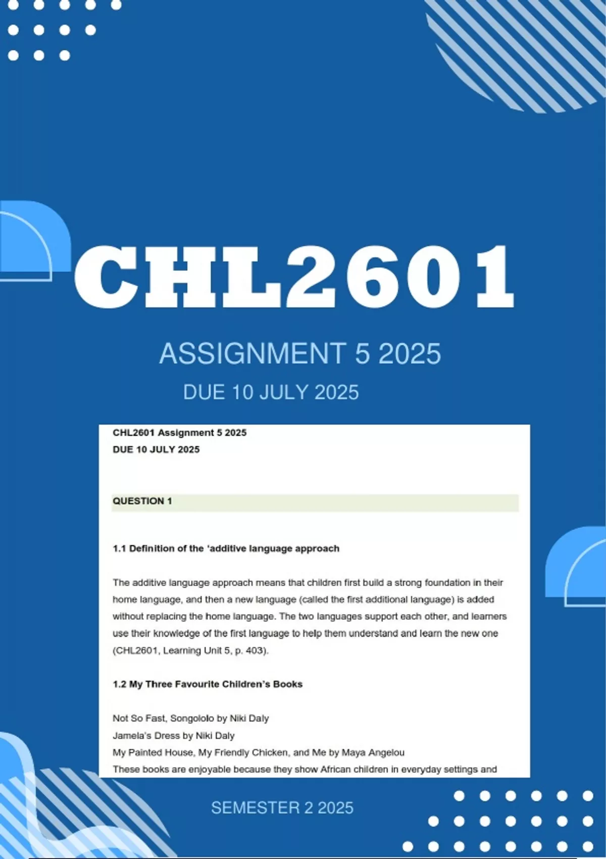 CHL2601 Assignment 5 DUE 10 JULY 2025 QUESTION 1 1.1 Definition of the ‘additive language approach The additive language approach means that children first build a strong foundation in their home language, and then a new language (called the first additional language) is added without replacing the home language. The two languages support each other, and learners use their knowledge of the first language to help them understand and learn the new one (CHL2601, Learning Unit 5, p. 403). 1.2 My Three Favourite Children’s Books Not So Fast, Songololo by Niki Daly Jamela’s Dress by Niki Daly My Painted House, My Friendly Chicken, and Me by Maya Angelou These books are enjoyable because they show African children in everyday settings and celebrate culture and identity. 1.3 Activity Using the Additive Language Approach: Teaching the English “th” Sound