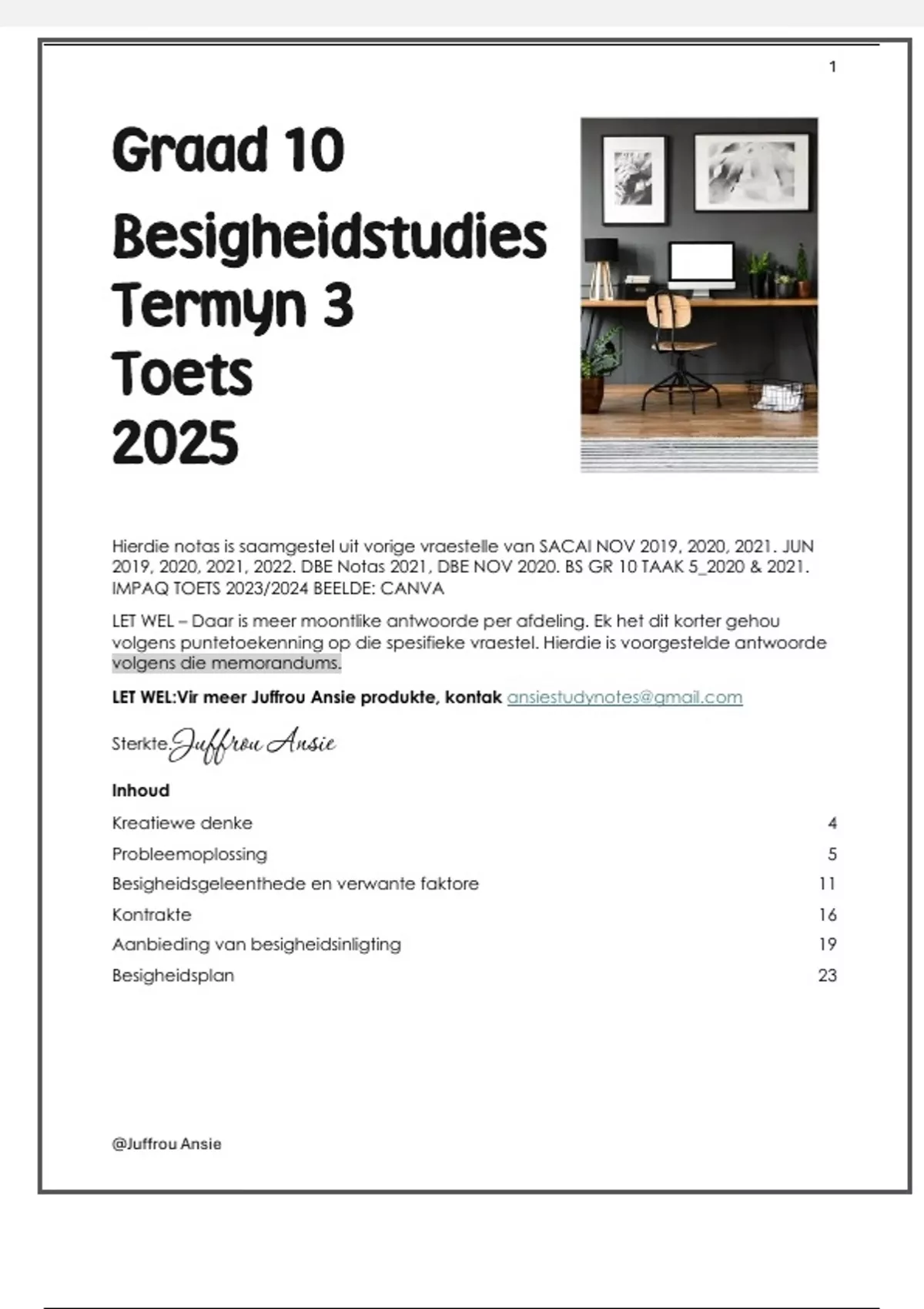 Inhoud Kreatiewe denke Probleemoplossing Besigheidsgeleenthede en verwante faktore Kontrakte Aanbieding van besigheidsinligting Besigheidsplan Hierdie notas is saamgestel uit vorige vraestelle van SACAI NOV 2019, 2020, 2021. JUN 2019, 2020, 2021, 2022. DBE Notas 2021, DBE NOV 2020. BS GR 10 TAAK 5_2020 & 2021. IMPAQ TOETS 2023/2024 BEELDE: CANVA