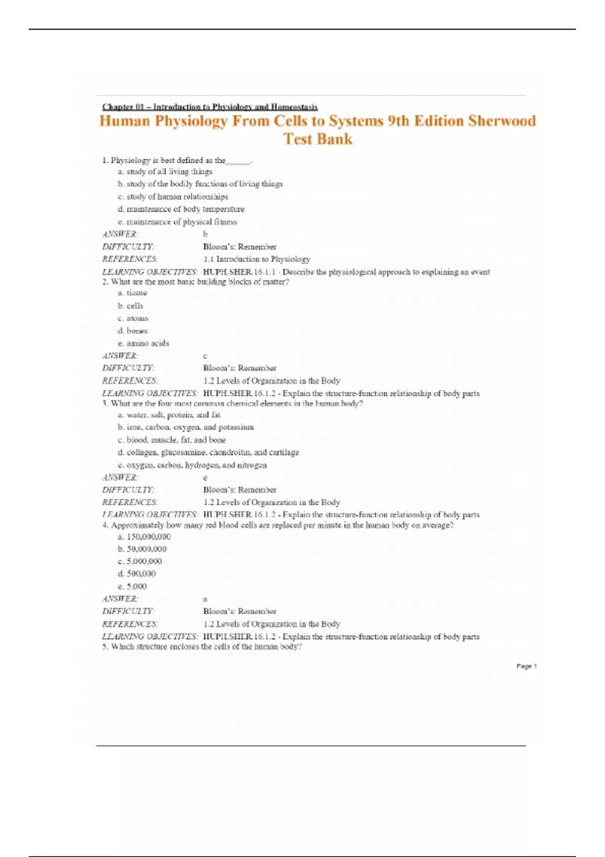 Test Bank for Human Physiology From Cells to Systems 9th Edition Sherwood Chapter 1 - 20 | Updated Guide 2025