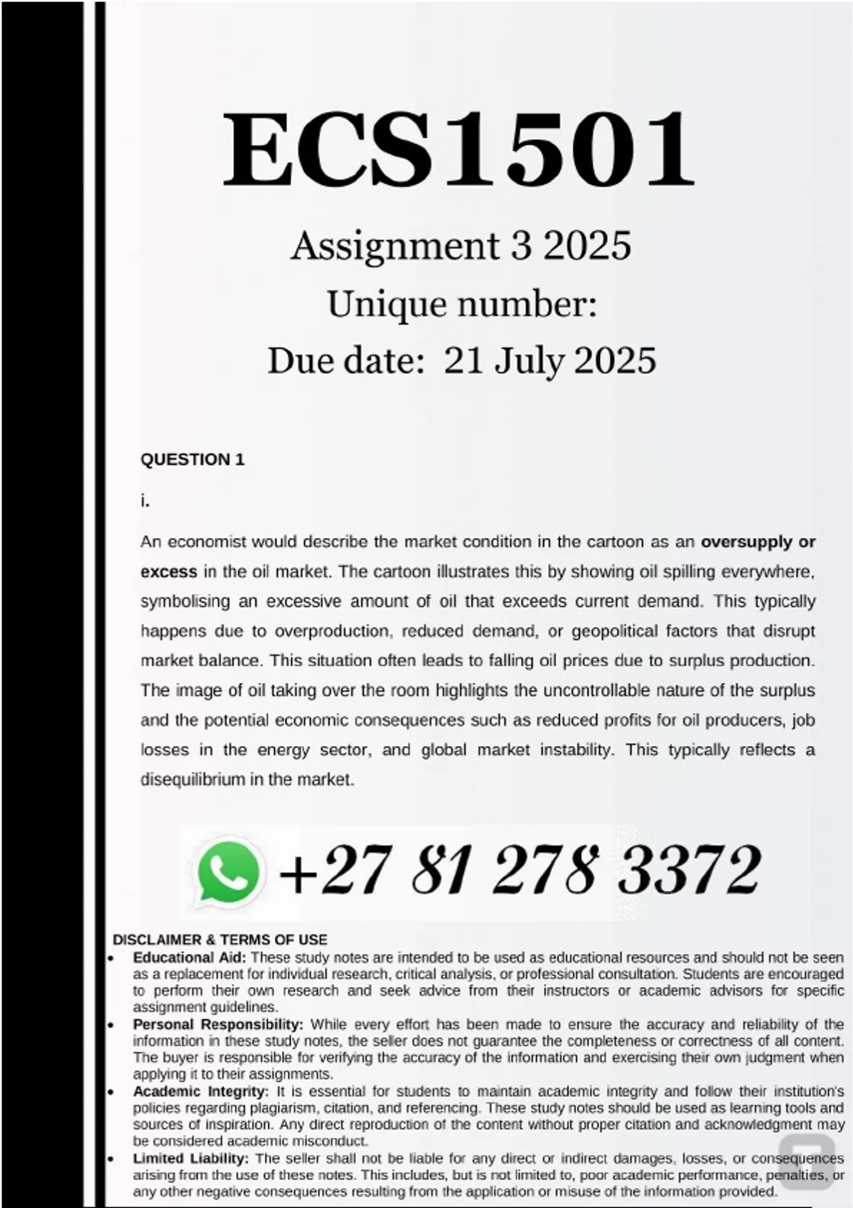 ECS1501 Assignment 3 (100% ANSWERS) 2025 - DUE 21 July 2025 ......Question 1 (12 marks) Maximum word count: 100 words This question is based on the following cartoon: (i) What word/words will an economist use to describe the market condition depicted in the cartoon (ii) Draw a diagram of the market for oil that illustrates the market condition depicted in the cartoon. (iii) Explain the adjustment process to the new equilibrium position in the market for oil. Question 2 (5 marks) No words allowed, only a diagram with annotations To answer this question, only a diagram with annotations is required. Suppose beer and peanuts are complements. In anticipation of warm weather conditions, Injabulo Breweries, the brewers of Number One beer, increased the production of Number One beer. Show on a diagram how this will affect the market for peanuts. Indicate how the equilibrium price and equilibrium quantity of peanuts will change. The direction of any changes should be indicated using arrows. Question 3 (13 marks) Maximum word count: 250 words Beetle Juice, a budget-friendly drinks producer targeting the student market, is currently facing supply challenges due to a key ingredient being negatively affected by tariff policies introduced under President Trump’s “Liberation Day” announcement. While Beetle Juice has enjoyed steady sales because of its low price, it remains a second-choice option for many students. When financial circumstances improve, such as during student grant payout periods, they tend to switch their preference to more popular big-brand alternatives like Rhino Juice or Makhulu Juice. 2 With the National Student Financial Aid Scheme (NFSAS) grants currently being disbursed, explain how the market for Beetle Juice is affected by these changes. Clearly indicate the effect on the equilibrium price and equilibrium quantity of Beetle Juice. You should use a combination of diagrams and written explanations in your answer.