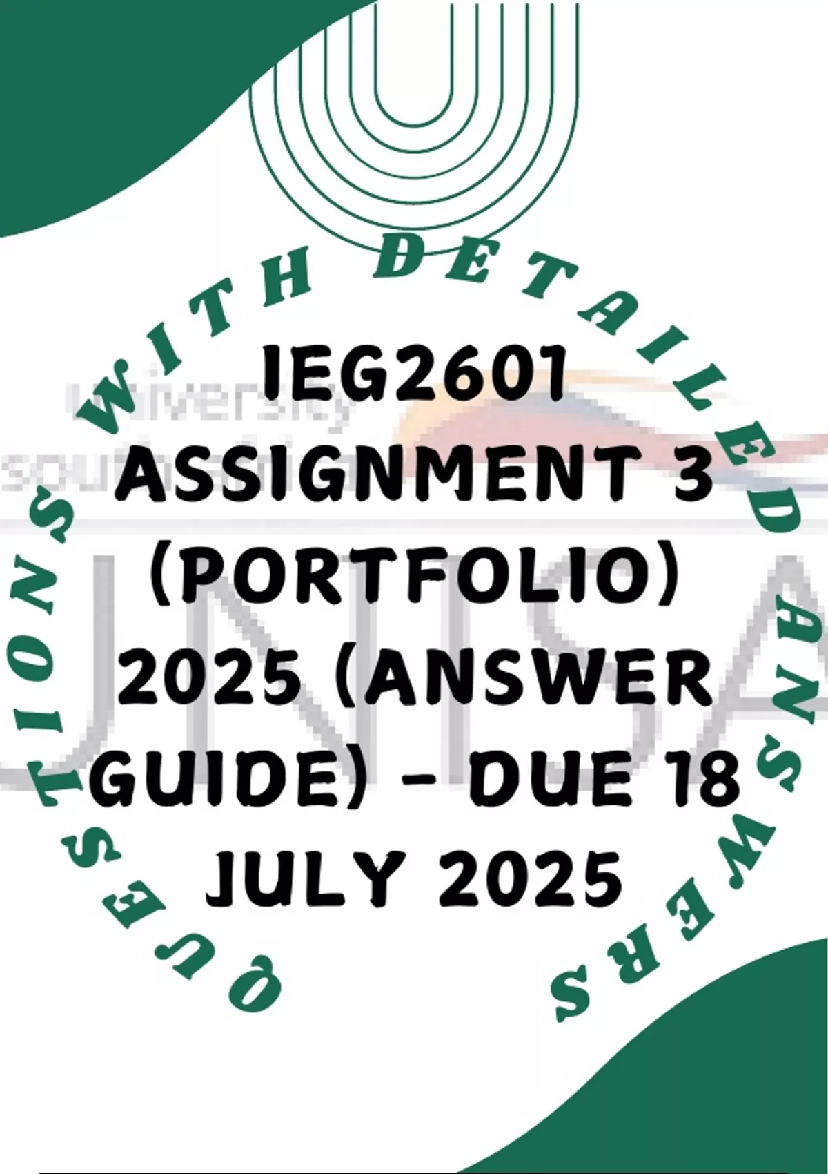 IEG2601 Assignment 3 (Portfolio) 2025 (Answer Guide) - Due 18 July 2025 QUESTION 1 According to Nel and Hugo (2017), inclusion emphasises that everyone in any community is respected, accommodated, and valued. This means accepting each learner for who they are, despite their different needs, appearances, ways of living, and cultures. 1.1 Key Characteristics that Define an Inclusive and Effective Grade R Teaching and Learning Space An inclusive and effective Grade R teaching and learning space is characterised firstly by physical and emotional accessibility. This means that the classroom environment is arranged in such a way that all learners, including those with physical, sensory, or learning disabilities, can participate fully. For example, furniture is arranged to accommodate mobility aids, visual displays cater to visual learners, and routines are predictable to provide emotional security (Nel & Hugo, 2017). Secondly, such a space promotes diversity and cultural responsiveness. This involves recognising and celebrating the various cultural, linguistic, and socio-economic backgrounds of learners. Teaching resources, classroom decorations, and daily interactions reflect and respect learners’ diverse identities, helping them feel acknowledged and valued, which is essential for building self-esteem and a sense of belonging (Nel & Hugo, 2017). 1.2 Significance of Creating Inclusive and Effective Grade R Spaces Creating inclusive and effective Grade R spaces is essential because early learning environments significantly influence children’s cognitive, social, and emotional development. An inclusive space fosters a sense of belonging, where every learner feels safe, respected, and capab