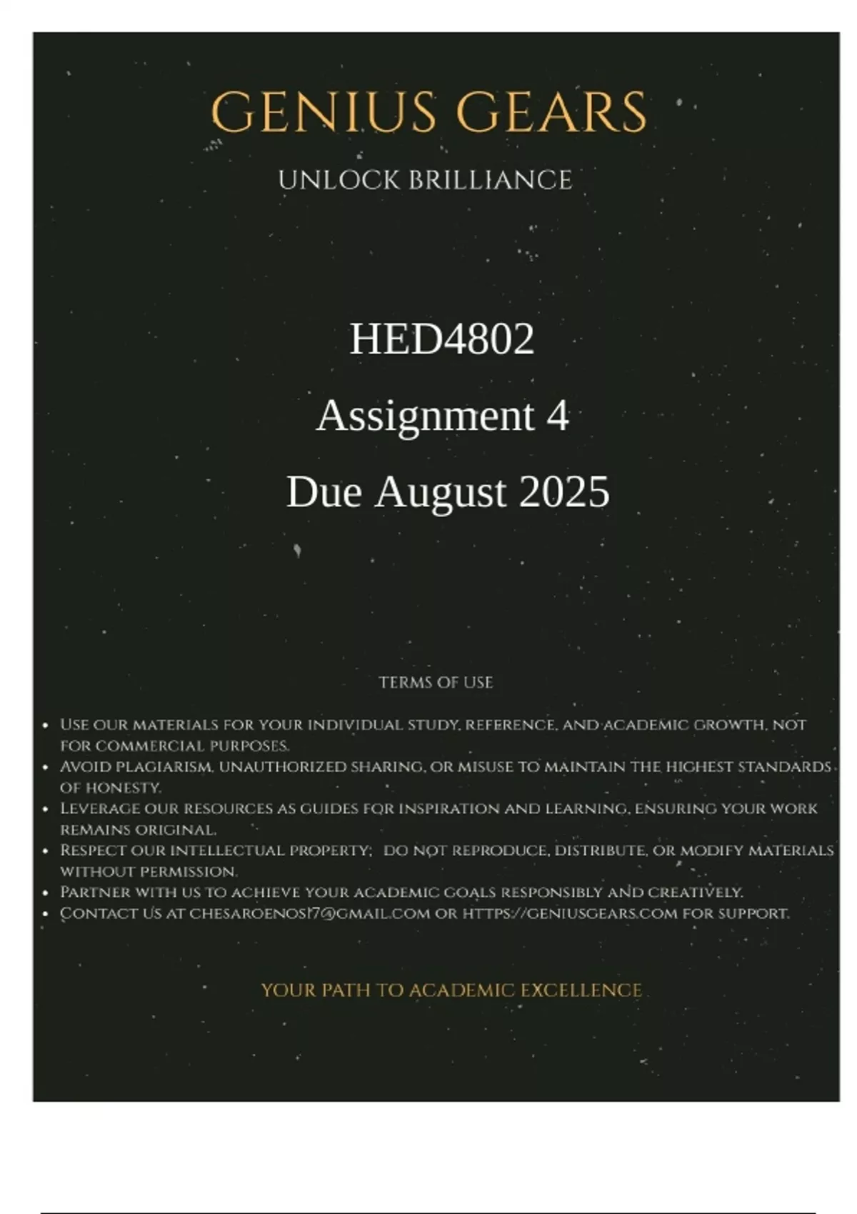 Unlock Your Academic Potential with the Ultimate Study Companion with HED4802 Assignment 4 2025 Due August 2025 This 100% exam-ready assignment offers expertly verified answers, comprehensive explanations, and credible academic references—meticulously developed to ensure a clear understanding of every concept. Designed with clarity, precision, and academic integrity, this fully solved resource is your key to mastering the subject and excelling in your assessments. Don’t just study—study strategically. Take charge of your academic journey today and elevate your performance with confidence.