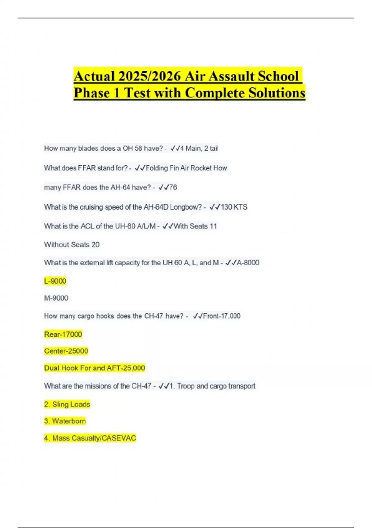 Actual 2025/2026 Air Assault School Phase 1 Test with Complete Solutions How many blades does a OH 58 have? - ️️4 Main, 2 tail What does FFAR stand for? - ️️Folding Fin Air Rocket How many FFAR does the AH-64 have? - ️️76 What is the cruising speed of the AH-64D Longbow? - ️️130 KTS What is the ACL of the UH-60 A/L/M - ️️With Seats 11 Without Seats 20 What is the external lift capacity for the UH 60 A, L, and M - ️️A-8000 L-9000 M-9000 How many cargo hooks does the CH-47 have? - ️️Front-17,000 Rear-17000 Center-25000 Dual Hook For and AFT-25,000 What are the missions of the CH-47 - ️️1. Troop and cargo transport 2. Sling Loads 3. Waterborn 4. Mass Casualty/CASEVAC