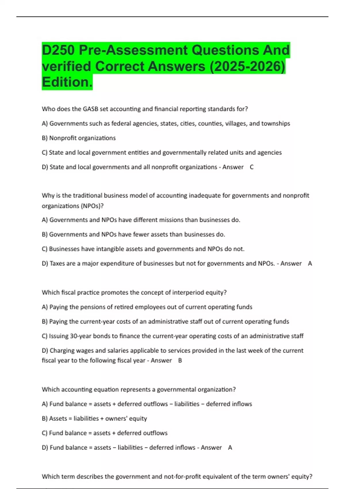 Who does the GASB set accounting and financial reporting standards for? A) Governments such as federal agencies, states, cities, counties, villages, and townships B) Nonprofit organizations C) State and local government entities and governmentally related units and agencies D) State and local governments and all nonprofit organizations - Answer C Why is the traditional business model of accounting inadequate for governments and nonprofit organizations (NPOs)? A) Governments and NPOs have different missions than businesses do. B) Governments and NPOs have fewer assets than businesses do. C) Businesses have intangible assets and governments and NPOs do not. D) Taxes are a major expenditure of businesses but not for governments and NPOs. - Answer A Which fiscal practice promotes the concept of interperiod equity? A) Paying the pensions of retired employees out of current operating funds B) Paying the current-year costs of an administrative staff out of current operating funds C) Issuing 30-year bonds to finance the current-year operating costs of an administrative staff D) Charging wages and salaries applicable to services provided in the last week of the current fiscal year to the following fiscal year - Answer B Which accounting equation represents a governmental organization? A) Fund balance = assets + deferred outflows − liabilities − deferred inflows B) Assets = liabilities + owners' equity C) Fund balance = assets + deferred outflows D) Fund balance = assets − liabilities − deferred inflows - Answer A Which term describes the government and not-for-profit equivalent of the term owners' equity? A) Fund balance B) Net profit C) Inflow of resources D) Total assets - Answer A