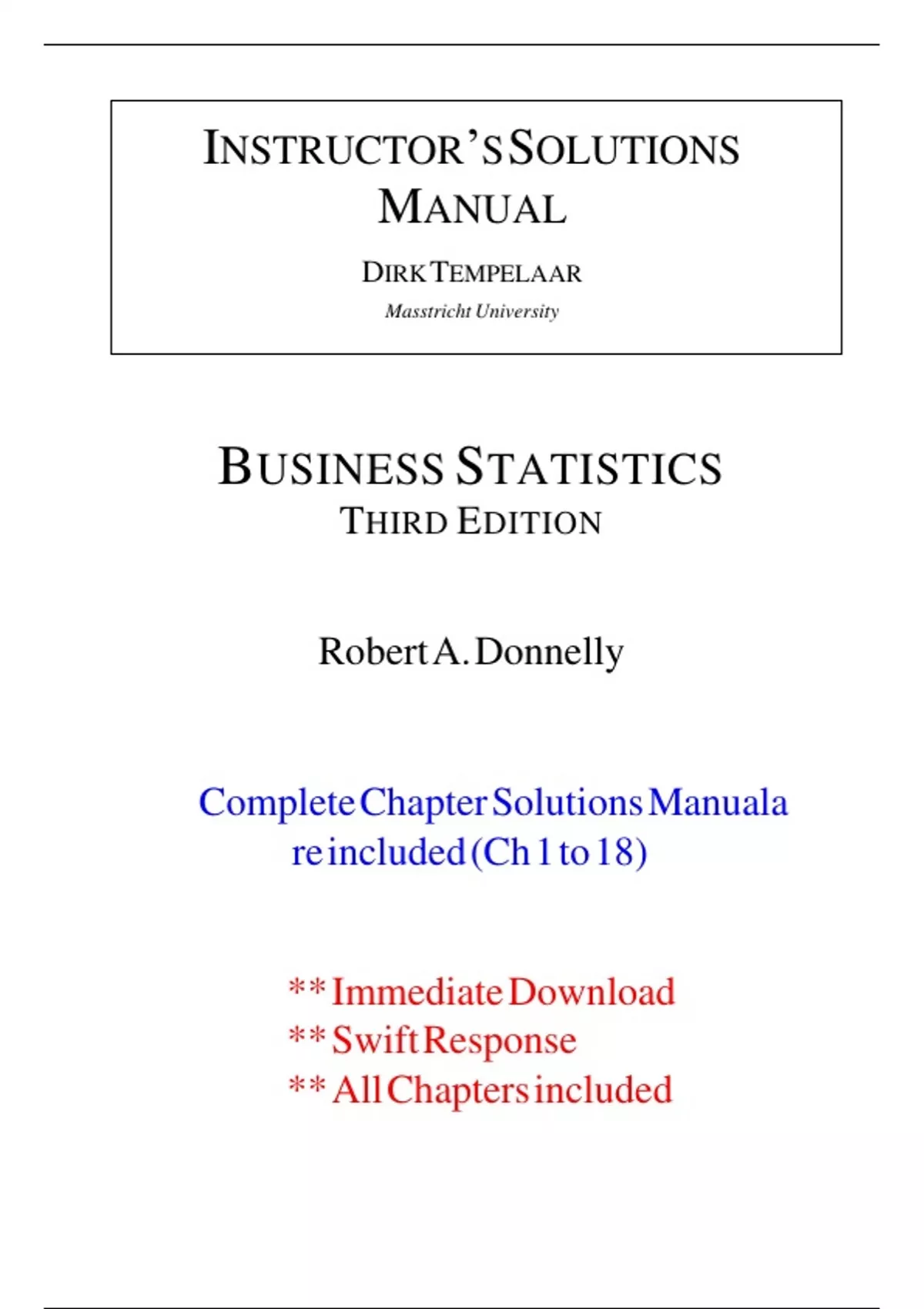 This document contains the complete Instructor’s Solutions Manual for Business Statistics (3rd Edition) by Robert A. Donnelly. It provides detailed, step-by-step solutions to all problems from Chapters 1 through 18. Topics include descriptive statistics, probability distributions, hypothesis testing, regression analysis, forecasting, decision analysis, ANOVA, chi-square, and nonparametric statistics. Each chapter includes fully worked examples, relevant calculations, and visual aids like tables and histograms, making this an essential resource for instructors and students in business and applied statistics courses. (Full Chapters included Chapter 1 to 18)....1.An Introduction to Business Statistics 2.Displaying Descriptive Statistics 3.Calculating Descriptive Statistics 4.Introduction to Probabilities 5.Discrete Probability Distributions 6.Continuous Probability Distributions 7.Sampling and Sampling Distributions 8.Confidence Intervals 9.Hypothesis Testing for a Single Population 10.Hypothesis Tests Comparing Two Populations 11.Analysis of Variance (ANOVA) Procedures 12.Chi-Square Tests 13.Hypothesis Tests for the Population Variance 14.Correlation and Simple Linear Regression 15.Multiple Regression and Model Building 16.Forecasting 17.Decision Analysis 18.Nonparametric Statistics