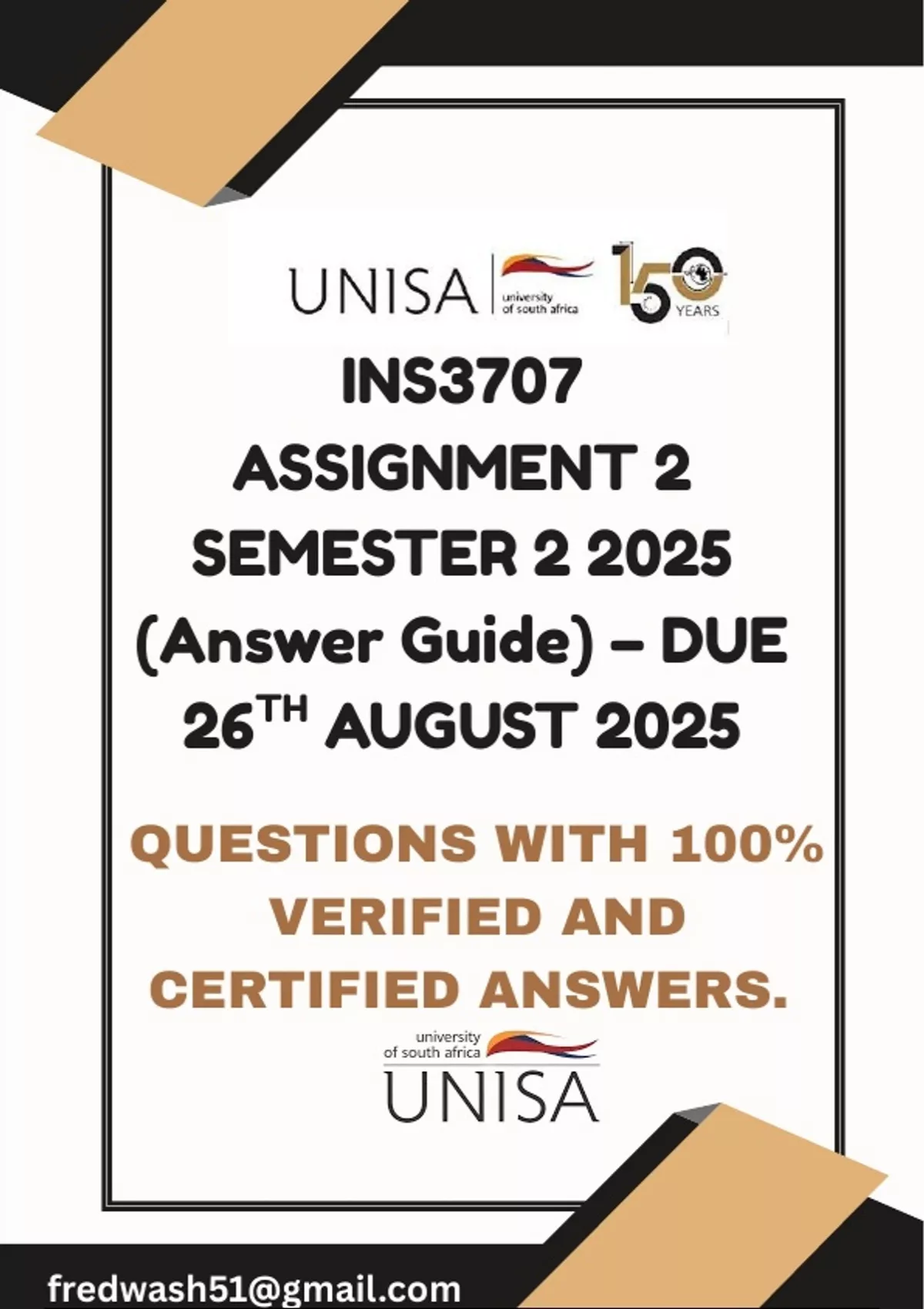 INS3707 ASSIGNMENT 2 SEMESTER 2 2025 (Answer Guide) – DUE 26TH AUGUST 2025 VERIFIED AND CERTIFIED ANSWERS. WRITTEN IN REQUIRED FORMAT AND WITHIN GIVEN GUIDELINES. IT IS GOOD TO USE AS A GUIDE AND FOR REFERENCE, NEVER PLAGARIZE. Thank you and success in your academics. UNISA, 2025