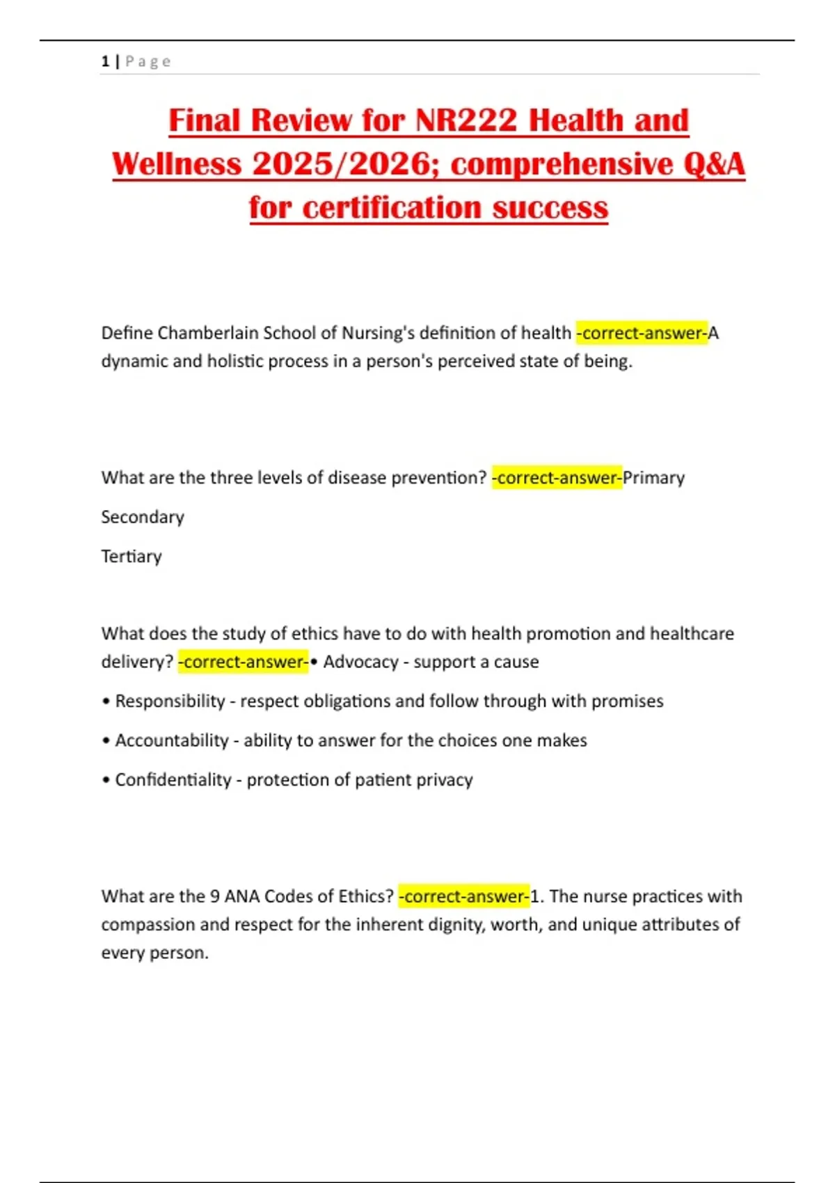 Final Review for NR222 Health and Wellness 2025/2026; comprehensive Q&A for certification success