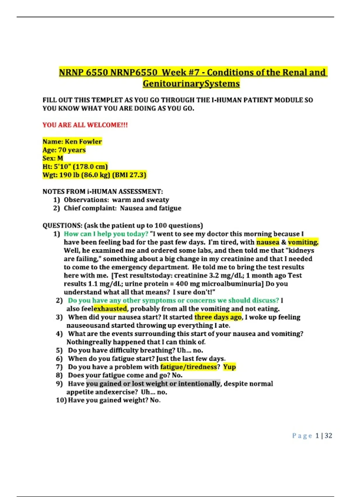 NRNP 6550 - NRNP6550 Week 7 - Conditions of the Renal and Genitourinary Systems