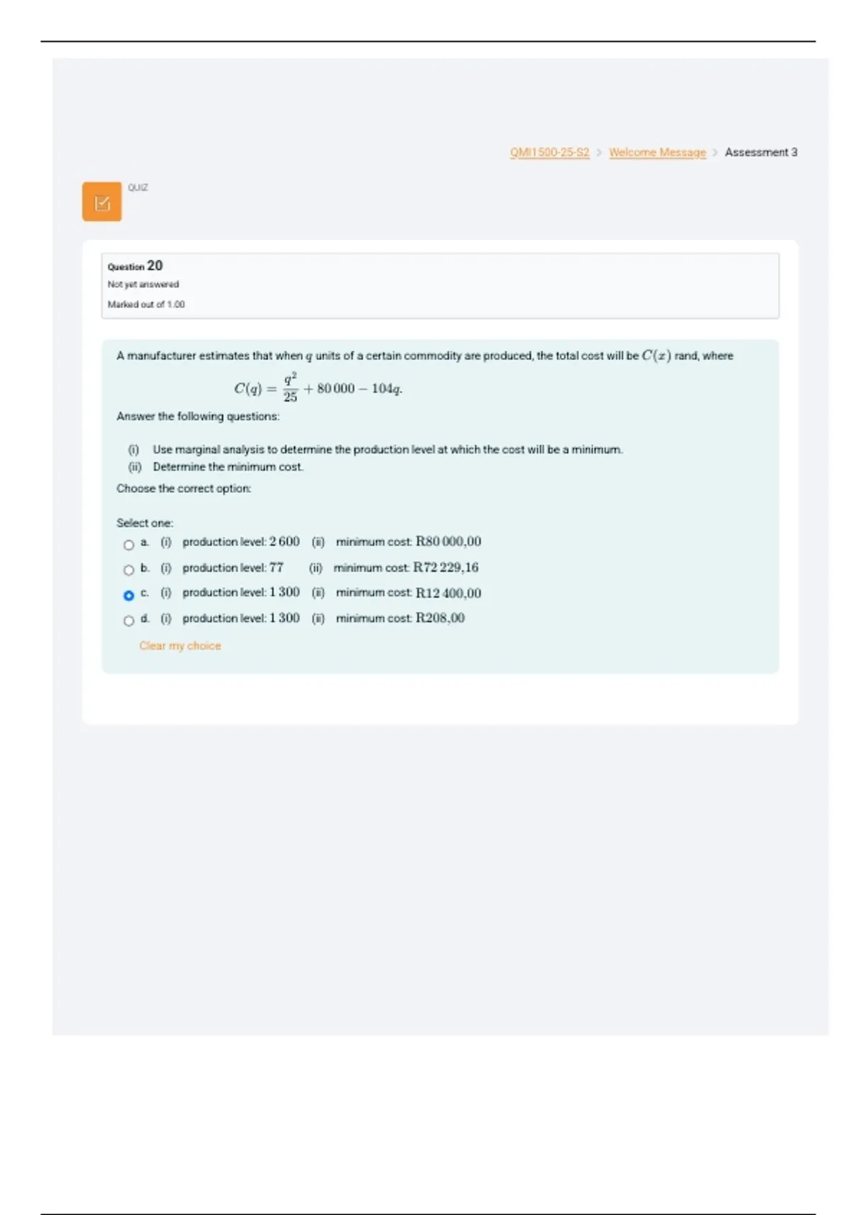 c. (i) production level: 1 300 (ii) minimum cost: R12 400,00
