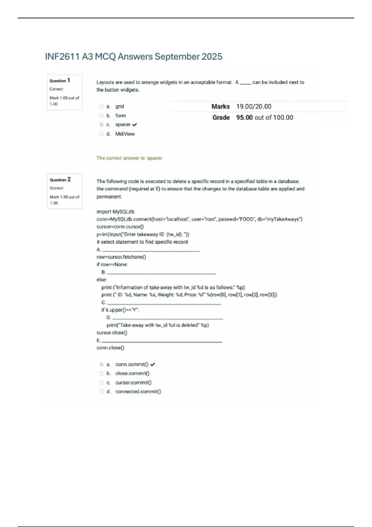 INF2611 Assignment 3 MCQ Answers 2025 Distincition Guaranteed The document contains the questions for assignment / assessment 3 for the module INF2611 visuall programming II (2) and contains multiple choise questions for 20 different questions. the correct ones are chosen to assist you in study and exam preparation. all the best!